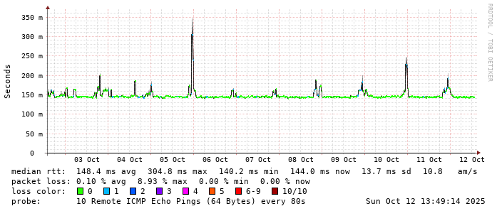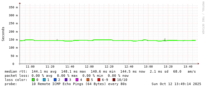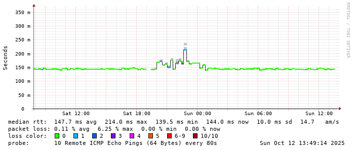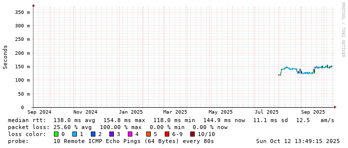 Start: 2025-10-12T04:00:40+0000HOST: ******** Loss% Snt Last Avg Best Wrst StDev 1. AS9678 103.98.75.193 0.0% 10 0.7 0.9 0.6 2.1 0.4 2. AS??? ??? 100.0 10 0.0 0.0 0.0 0.0 0.0 3. AS2914 ae-1.r25.taiptw01.tw.bb.gin.ntt.net 0.0% 10 0.5 0.9 0.5 2.5 0.6 4. AS2914 ae-10.r28.tkokhk01.hk.bb.gin.ntt.net 0.0% 10 20.7 20.7 20.5 20.8 0.1 5. AS2914 ae-3.r29.tkokhk01.hk.bb.gin.ntt.net 0.0% 10 20.6 20.6 20.4 20.9 0.2 6. AS2914 ae-6.r24.sngpsi07.sg.bb.gin.ntt.net 20.0% 10 59.9 59.9 59.8 60.1 0.1 7. AS2914 ae-4.a02.sngpsi07.sg.bb.gin.ntt.net 0.0% 10 64.1 64.1 64.0 64.5 0.1 8. AS2914 ae-0.amazon.sngpsi07.sg.bb.gin.ntt.net 0.0% 10 67.8 72.2 67.4 86.1 6.3 9. AS??? ??? 100.0 10 0.0 0.0 0.0 0.0 0.0 10. AS??? ??? 100.0 10 0.0 0.0 0.0 0.0 0.0 11. AS??? ??? 100.0 10 0.0 0.0 0.0 0.0 0.0 12. AS??? ??? 100.0 10 0.0 0.0 0.0 0.0 0.0 13. AS??? ??? 100.0 10 0.0 0.0 0.0 0.0 0.0 14. AS??? ??? 100.0 10 0.0 0.0 0.0 0.0 0.0 15. AS??? ??? 100.0 10 0.0 0.0 0.0 0.0 0.0 16. AS??? ??? 100.0 10 0.0 0.0 0.0 0.0 0.0 17. AS??? ??? 100.0 10 0.0 0.0 0.0 0.0 0.0 18. AS??? ??? 100.0 10 0.0 0.0 0.0 0.0 0.0 19. AS16509 ec2-52-66-66-2.ap-south-1.compute.amazonaws.com 0.0% 10 143.4 143.4 143.3 143.5 0.1