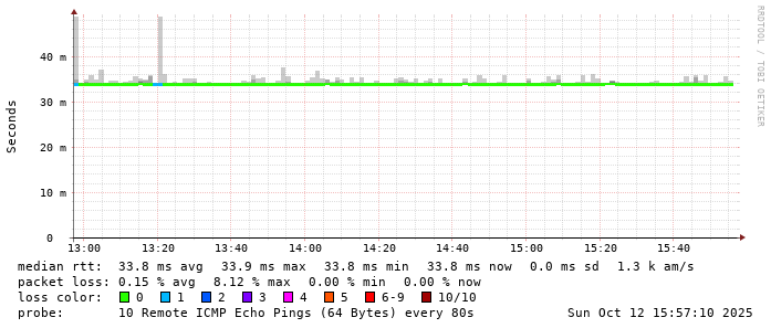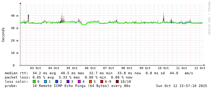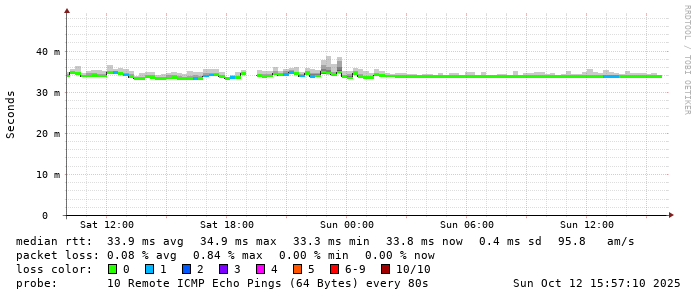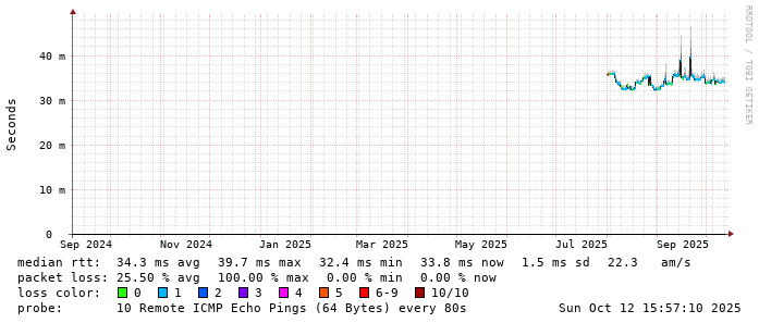 Start: 2025-10-12T04:00:03+0000HOST: ******** Loss% Snt Last Avg Best Wrst StDev 1. AS9678 103.98.75.193 0.0% 10 0.8 0.8 0.7 0.9 0.1 2. AS??? tw52.as9678.net 0.0% 10 1.1 1.1 1.0 1.3 0.1 3. AS??? ??? 100.0 10 0.0 0.0 0.0 0.0 0.0 4. AS??? ??? 100.0 10 0.0 0.0 0.0 0.0 0.0 5. AS??? ??? 100.0 10 0.0 0.0 0.0 0.0 0.0 6. AS??? ??? 100.0 10 0.0 0.0 0.0 0.0 0.0 7. AS??? ??? 100.0 10 0.0 0.0 0.0 0.0 0.0 8. AS??? ??? 100.0 10 0.0 0.0 0.0 0.0 0.0 9. AS??? ??? 100.0 10 0.0 0.0 0.0 0.0 0.0 10. AS16509 ec2-176-34-56-254.ap-northeast-1.compute.amazonaws.com 0.0% 10 35.8 34.6 33.8 36.1 0.9