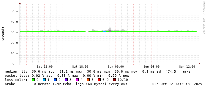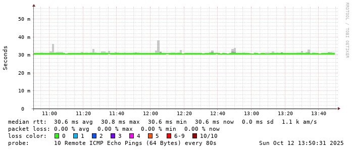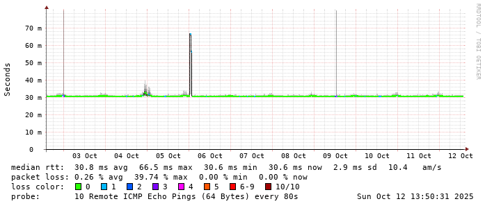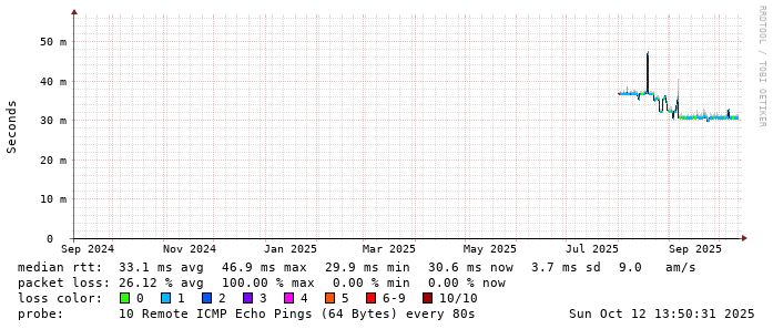 Start: 2025-10-12T04:03:26+0000HOST: ******** Loss% Snt Last Avg Best Wrst StDev 1. AS9678 103.98.75.193 0.0% 10 1.4 0.9 0.7 1.4 0.2 2. AS??? tw52.as9678.net 0.0% 10 1.0 1.2 1.0 1.6 0.2 3. AS??? ??? 100.0 10 0.0 0.0 0.0 0.0 0.0 4. AS3491 fastly.bundle31.br02.tok02.as3491.net 0.0% 10 34.5 33.3 32.3 36.2 1.4 5. AS19551 103.28.250.169.ip.incapdns.net 0.0% 10 30.7 30.7 30.6 30.8 0.1