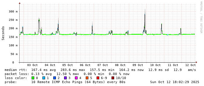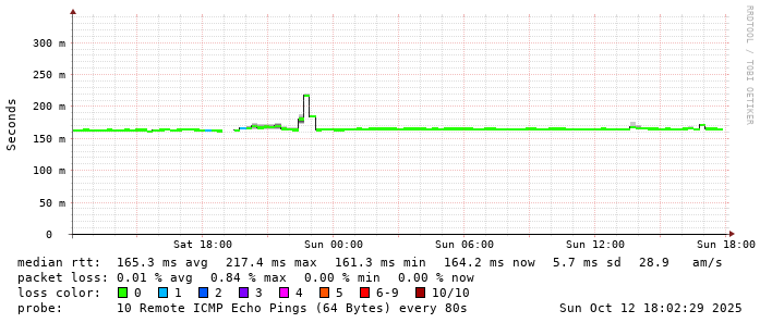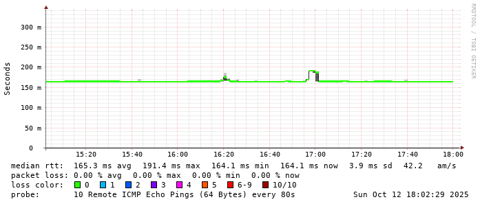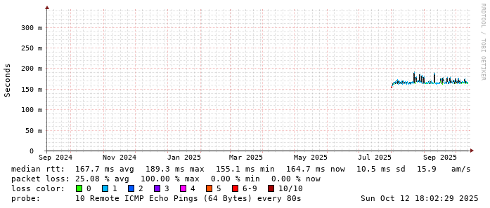 Start: 2025-10-12T04:04:17+0000HOST: ******** Loss% Snt Last Avg Best Wrst StDev 1. AS9678 103.98.75.193 0.0% 10 0.8 0.8 0.7 0.9 0.1 2. AS??? ??? 100.0 10 0.0 0.0 0.0 0.0 0.0 3. AS2914 ae-1.r25.taiptw01.tw.bb.gin.ntt.net 0.0% 10 0.9 0.7 0.4 1.3 0.3 4. AS2914 ae-10.r28.tkokhk01.hk.bb.gin.ntt.net 0.0% 10 25.7 21.1 20.4 25.7 1.6 5. AS2914 ae-24.a00.newthk04.hk.bb.gin.ntt.net 0.0% 10 28.2 28.1 27.9 28.2 0.1 6. AS7473 203.208.178.230 0.0% 10 28.8 28.9 28.6 30.0 0.4 7. AS7473 203.208.154.13 0.0% 10 21.3 21.9 21.2 24.7 1.2 8. AS7473 203.208.147.114 0.0% 10 145.0 145.0 144.8 145.2 0.1 9. AS7474 61.88.33.3 20.0% 10 169.9 168.8 168.1 170.0 0.8 10. AS7474 61.88.33.1 0.0% 10 166.3 167.1 166.1 168.4 0.8 11. AS??? ??? 100.0 10 0.0 0.0 0.0 0.0 0.0 12. AS??? ??? 100.0 10 0.0 0.0 0.0 0.0 0.0 13. AS??? ??? 100.0 10 0.0 0.0 0.0 0.0 0.0 14. AS??? ??? 100.0 10 0.0 0.0 0.0 0.0 0.0 15. AS4804 33vsnpr01-hu0-6-0-1.npr.optusnet.com.au 0.0% 10 164.6 164.6 164.4 165.3 0.3 16. AS??? ??? 100.0 10 0.0 0.0 0.0 0.0 0.0 17. AS??? ??? 100.0 10 0.0 0.0 0.0 0.0 0.0 18. AS4804 sun4-vl300.gw.optusnet.com.au 0.0% 10 171.0 171.6 171.0 176.1 1.6 19. AS4804 time01.mel.optusnet.com.au 0.0% 10 164.6 164.2 164.1 164.6 0.1