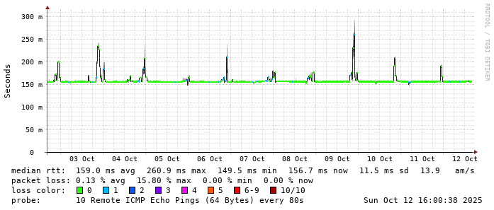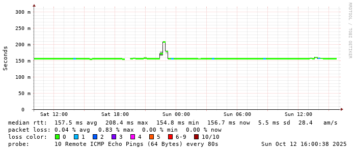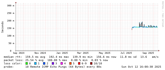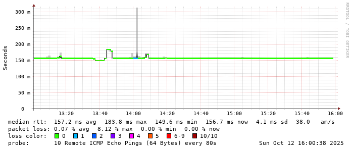 Start: 2025-10-12T04:04:40+0000HOST: ******** Loss% Snt Last Avg Best Wrst StDev 1. AS9678 103.98.75.193 0.0% 10 0.8 1.1 0.7 2.4 0.6 2. AS??? ??? 100.0 10 0.0 0.0 0.0 0.0 0.0 3. AS2914 ae-1.r25.taiptw01.tw.bb.gin.ntt.net 0.0% 10 0.5 0.7 0.4 1.0 0.2 4. AS2914 ae-10.r28.tkokhk01.hk.bb.gin.ntt.net 0.0% 10 20.5 20.8 20.5 22.0 0.5 5. AS2914 ae-24.a00.newthk04.hk.bb.gin.ntt.net 0.0% 10 28.0 28.0 27.8 29.1 0.4 6. AS7473 203.208.178.230 0.0% 10 28.7 28.7 28.6 28.9 0.1 7. AS7473 203.208.154.13 0.0% 10 21.3 21.8 21.2 25.1 1.2 8. AS7473 203.208.147.114 0.0% 10 145.0 145.1 144.9 145.7 0.3 9. AS7474 61.88.33.4 50.0% 10 154.2 154.0 152.9 154.8 0.7 10. AS??? ??? 100.0 10 0.0 0.0 0.0 0.0 0.0 11. AS4804 22rrnpr01-hu0-7-0-1.npr.optusnet.com.au 0.0% 10 150.6 150.3 150.2 150.6 0.2 12. AS??? ??? 100.0 10 0.0 0.0 0.0 0.0 0.0 13. AS??? ??? 100.0 10 0.0 0.0 0.0 0.0 0.0 14. AS4804 mas4-vl300.gw.optusnet.com.au 50.0% 10 144.6 144.7 144.5 144.9 0.1 15. AS4804 time01.syd.optusnet.com.au 0.0% 10 156.6 156.8 156.6 158.2 0.5