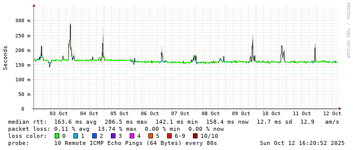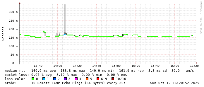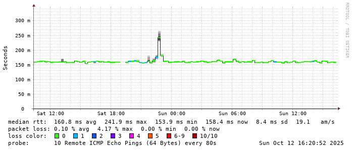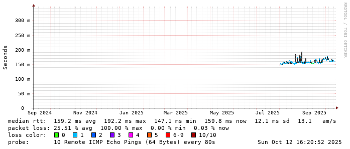Start: 2025-10-12T04:04:58+0000HOST: ******** Loss% Snt Last Avg Best Wrst StDev 1. AS9678 103.98.75.193 0.0% 10 0.7 0.9 0.7 2.1 0.4 2. AS??? ??? 100.0 10 0.0 0.0 0.0 0.0 0.0 3. AS2914 ae-1.r25.taiptw01.tw.bb.gin.ntt.net 0.0% 10 1.1 0.8 0.5 1.1 0.2 4. AS2914 ae-10.r28.tkokhk01.hk.bb.gin.ntt.net 0.0% 10 20.7 20.7 20.4 21.8 0.4 5. AS2914 ae-24.a00.newthk04.hk.bb.gin.ntt.net 0.0% 10 27.8 30.7 27.8 36.9 3.4 6. AS2914 ae-0.lumen.newthk04.hk.bb.gin.ntt.net 0.0% 10 30.9 31.0 28.7 40.5 3.6 7. AS3356 ae1.3505.edge3.Singapore3.level3.net 0.0% 10 72.5 82.1 71.3 113.4 13.2 8. AS3356 8.245.2.186 0.0% 10 73.1 71.8 71.5 73.1 0.5 9. AS??? ??? 100.0 10 0.0 0.0 0.0 0.0 0.0 10. AS9268 WelcomeToAussieBroadband.per.otw.net.au 0.0% 10 164.4 164.2 164.0 164.4 0.1 11. AS??? ??? 100.0 10 0.0 0.0 0.0 0.0 0.0 12. AS??? ??? 100.0 10 0.0 0.0 0.0 0.0 0.0 13. AS??? ??? 100.0 10 0.0 0.0 0.0 0.0 0.0 14. AS??? ??? 100.0 10 0.0 0.0 0.0 0.0 0.0 15. AS??? ??? 100.0 10 0.0 0.0 0.0 0.0 0.0 16. AS??? ??? 100.0 10 0.0 0.0 0.0 0.0 0.0 17. AS??? ??? 100.0 10 0.0 0.0 0.0 0.0 0.0 18. AS??? ??? 100.0 10 0.0 0.0 0.0 0.0 0.0 19. AS??? ??? 100.0 10 0.0 0.0 0.0 0.0 0.0 20. AS??? ??? 100.0 10 0.0 0.0 0.0 0.0 0.0 21. AS??? ??? 100.0 10 0.0 0.0 0.0 0.0 0.0 22. AS9268 gen-119-17-161-179.ptr4.otw.net.au 0.0% 10 164.4 164.3 164.1 164.4 0.1