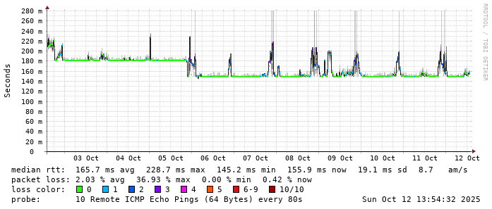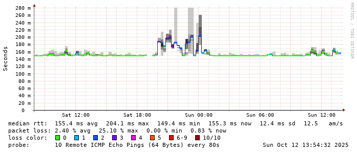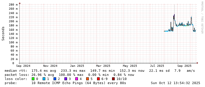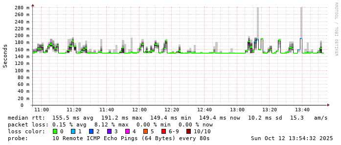 Start: 2025-10-12T04:08:18+0000HOST: ******** Loss% Snt Last Avg Best Wrst StDev 1. AS9678 103.98.75.193 0.0% 10 0.8 1.0 0.8 2.1 0.4 2. AS??? tw52.as9678.net 0.0% 10 1.5 1.2 0.9 2.0 0.3 3. AS??? ??? 100.0 10 0.0 0.0 0.0 0.0 0.0 4. AS9808 223.118.6.38 0.0% 10 1.0 1.1 1.0 1.2 0.1 5. AS58453 223.118.5.137 0.0% 10 3.6 3.8 3.5 4.4 0.3 6. AS58453 223.118.5.142 0.0% 10 46.5 47.2 46.3 50.5 1.2 7. AS58453 223.118.2.161 0.0% 10 46.3 46.3 46.2 46.4 0.1 8. AS58453 223.118.4.18 0.0% 10 82.0 81.7 81.6 82.0 0.1 9. AS9808 223.118.4.218 0.0% 10 176.0 174.4 173.2 176.4 1.4 10. AS9808 223.119.82.110 0.0% 10 142.9 142.9 142.6 143.9 0.4 11. AS4637 i-91.sydp-core04.telstraglobal.net 0.0% 10 146.6 147.9 146.0 150.7 1.5 12. AS1221 bundle-ether4.pad-gw31.sydney.telstra.net 0.0% 10 152.8 153.3 152.5 154.1 0.5 13. AS1221 bundle-ether1.pad-gw30.sydney.telstra.net 0.0% 10 151.1 151.4 149.9 153.2 1.2 14. AS1221 bundle-ether5.stl-core30.sydney.telstra.net 0.0% 10 153.5 151.3 150.2 153.5 0.9 15. AS1221 bundle-ether1.chw-edge903.sydney.telstra.net 0.0% 10 150.2 154.3 149.9 180.8 9.5 16. AS1221 telstr1429.lnk.telstra.net 0.0% 10 149.8 150.3 149.7 154.0 1.3 17. AS1221 203.36.190.1 0.0% 10 149.5 149.9 149.4 150.9 0.5