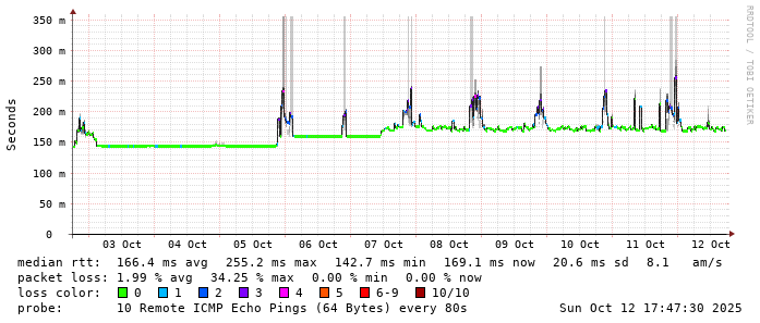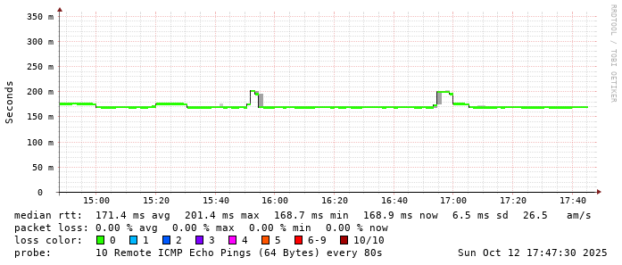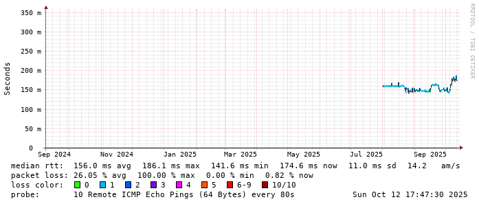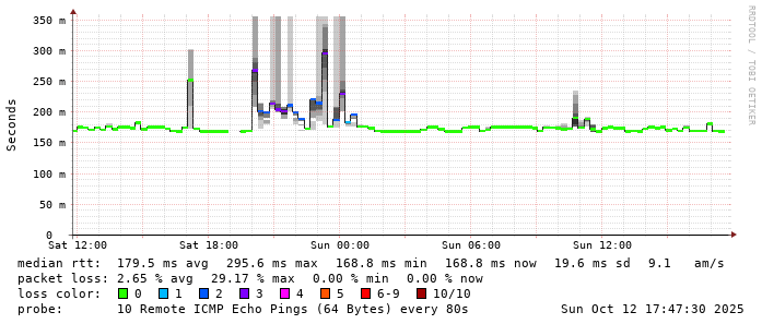 Start: 2025-10-12T04:07:22+0000HOST: ******** Loss% Snt Last Avg Best Wrst StDev 1. AS9678 103.98.75.193 0.0% 10 0.8 0.9 0.7 2.2 0.4 2. AS??? tw52.as9678.net 0.0% 10 1.1 1.1 0.9 1.4 0.1 3. AS??? ??? 100.0 10 0.0 0.0 0.0 0.0 0.0 4. AS9808 223.118.6.38 0.0% 10 1.1 1.2 1.0 1.3 0.1 5. AS58453 223.118.5.137 0.0% 10 3.5 3.5 3.5 3.6 0.0 6. AS58453 223.120.2.118 90.0% 10 47.8 47.8 47.8 47.8 0.0 7. AS6453 ix-bundle-57.qcore2.hk2-hongkong.as6453.net 80.0% 10 22.9 22.6 22.3 22.9 0.4 8. AS6453 if-bundle-5-2.qcore1.hk2-hongkong.as6453.net 80.0% 10 50.2 50.1 50.0 50.2 0.1 9. AS6453 if-ae-28-2.tcore2.tv2-tokyo.as6453.net 0.0% 10 48.6 50.7 48.6 69.6 6.6 10. AS6453 cix-xe-0-0-2-0.tcore2.tv2-tokyo.as6453.net 0.0% 10 145.9 146.3 145.9 147.0 0.4 11. AS9942 syd-gls-har-crt3-be-200.tpg.com.au 0.0% 10 165.8 165.9 165.6 166.5 0.3 12. AS7545 nme-apt-bur-crt3-be-10.tpgi.com.au 0.0% 10 176.1 176.2 175.9 176.5 0.2 13. AS7545 nme-apt-bur-csw4-hu-0-0-0-20.tpg.com.au 0.0% 10 176.3 176.4 176.2 176.9 0.2 14. AS7545 nme-sot-dry-crt2-be-30.tpgi.com.au 0.0% 10 176.2 177.5 176.2 179.3 1.1 15. AS7545 nme-sot-dry-wgw1-be-10.tpgi.com.au 0.0% 10 175.9 175.9 175.7 176.2 0.1