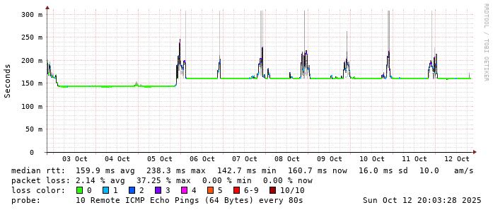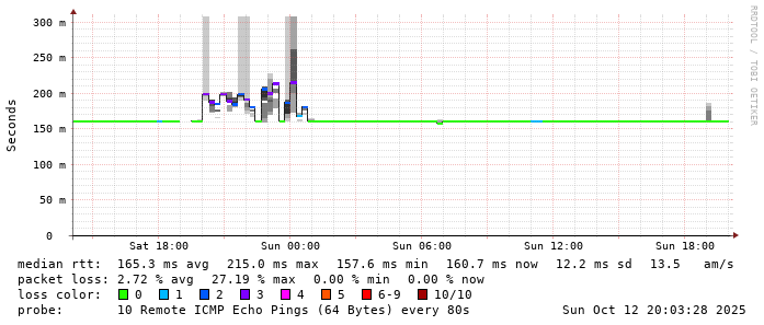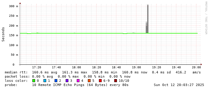 Start: 2025-10-12T04:07:42+0000HOST: ******** Loss% Snt Last Avg Best Wrst StDev 1. AS9678 103.98.75.193 0.0% 10 0.8 0.8 0.7 0.9 0.1 2. AS??? tw52.as9678.net 0.0% 10 1.1 1.2 1.1 1.4 0.1 3. AS??? ??? 100.0 10 0.0 0.0 0.0 0.0 0.0 4. AS9808 223.118.6.38 0.0% 10 1.3 1.2 1.1 1.7 0.2 5. AS58453 223.118.5.137 0.0% 10 3.5 3.7 3.5 3.8 0.1 6. AS58453 223.120.2.118 90.0% 10 46.3 46.3 46.3 46.3 0.0 7. AS6453 ix-bundle-57.qcore2.hk2-hongkong.as6453.net 80.0% 10 22.0 22.2 22.0 22.3 0.2 8. AS6453 if-bundle-5-2.qcore1.hk2-hongkong.as6453.net 60.0% 10 50.3 50.5 50.0 50.9 0.4 9. AS6453 if-ae-28-2.tcore2.tv2-tokyo.as6453.net 0.0% 10 51.2 50.9 50.4 51.9 0.6 10. AS6453 cix-xe-0-0-2-0.tcore2.tv2-tokyo.as6453.net 0.0% 10 147.9 147.9 147.7 148.6 0.3 11. AS9942 syd-gls-har-crt4-be-200.tpg.com.au 0.0% 10 167.8 167.7 167.6 167.9 0.1 12. AS7545 nme-apt-bur-crt4-be-10.tpgi.com.au 0.0% 10 161.7 161.7 161.4 161.9 0.2 13. AS7545 per-apt-stg-crt2-be-20.tpgi.com.au 0.0% 10 162.0 162.2 162.0 162.9 0.3 14. AS7545 per-apt-wgw1-be200.tpgi.com.au 0.0% 10 160.6 160.9 160.6 161.8 0.4