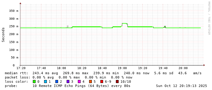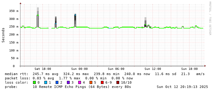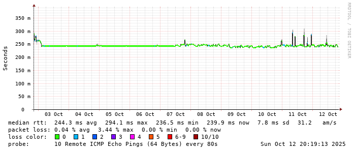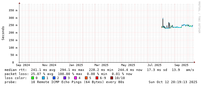Start: 2025-10-12T10:08:59+0000HOST: ******** Loss% Snt Last Avg Best Wrst StDev 1. AS9678 103.98.75.193 0.0% 10 0.9 0.9 0.7 1.3 0.2 2. AS??? ??? 100.0 10 0.0 0.0 0.0 0.0 0.0 3. AS2914 ae-1.r25.taiptw01.tw.bb.gin.ntt.net 0.0% 10 0.7 0.7 0.5 1.0 0.2 4. AS2914 ae-4.a01.taiptw01.tw.bb.gin.ntt.net 90.0% 10 0.5 0.5 0.5 0.5 0.0 5. AS6453 ix-ae-29-0.tcore1.tj5-taipei.as6453.net 0.0% 10 0.6 0.7 0.5 1.5 0.3 6. AS6453 if-bundle-61-2.qcore2.tv2-tokyo.as6453.net 70.0% 10 149.2 148.9 148.4 149.2 0.4 7. AS6453 if-ae-58-2.tcore1.av3-toyohashi.as6453.net 0.0% 10 150.9 149.6 148.5 154.4 1.8 8. AS6453 if-ae-59-2.tcore2.av3-toyohashi.as6453.net 0.0% 10 148.0 147.6 147.3 148.0 0.2 9. AS6453 if-bundle-28-2.qcore1.lvw-losangeles.as6453.net 80.0% 10 149.3 148.8 148.3 149.3 0.7 10. AS9942 203-220-16-130.tpgi.com.au 0.0% 10 241.9 240.6 240.3 241.9 0.5 11. AS133612 203.171.205.155 0.0% 10 240.2 240.1 239.9 240.5 0.2 12. AS133612 ns2.vodafone.com.au.56.119.101.in-addr.arpa 0.0% 10 241.0 240.1 239.9 241.0 0.3