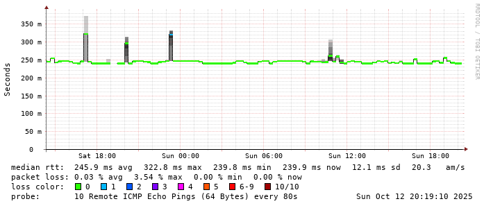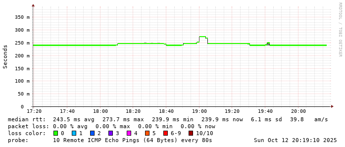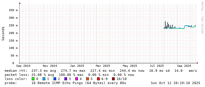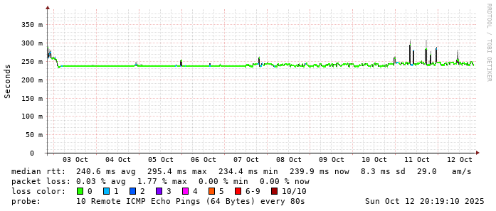 Start: 2025-10-12T10:09:16+0000HOST: ******** Loss% Snt Last Avg Best Wrst StDev 1. AS9678 103.98.75.193 0.0% 10 1.7 1.1 0.7 2.0 0.4 2. AS??? ??? 100.0 10 0.0 0.0 0.0 0.0 0.0 3. AS2914 ae-1.r25.taiptw01.tw.bb.gin.ntt.net 0.0% 10 0.5 0.8 0.5 1.2 0.3 4. AS2914 ae-4.a01.taiptw01.tw.bb.gin.ntt.net 90.0% 10 0.4 0.4 0.4 0.4 0.0 5. AS6453 ix-ae-29-0.tcore1.tj5-taipei.as6453.net 0.0% 10 0.6 0.7 0.5 1.0 0.1 6. AS6453 if-bundle-61-2.qcore2.tv2-tokyo.as6453.net 80.0% 10 149.2 148.8 148.4 149.2 0.5 7. AS6453 if-ae-58-2.tcore1.av3-toyohashi.as6453.net 0.0% 10 148.7 148.9 148.5 150.6 0.6 8. AS6453 if-ae-59-2.tcore2.av3-toyohashi.as6453.net 0.0% 10 147.4 147.4 147.3 147.7 0.2 9. AS6453 if-bundle-28-2.qcore1.lvw-losangeles.as6453.net 90.0% 10 148.6 148.6 148.6 148.6 0.0 10. AS9942 203-220-16-130.tpgi.com.au 0.0% 10 240.4 240.4 240.2 240.5 0.1 11. AS133612 203.171.205.155 0.0% 10 240.1 241.7 240.0 251.3 3.8 12. AS133612 ns1.vodafone.com.au.0.11.119.in-addr.arpa 0.0% 10 240.4 240.2 239.9 241.3 0.4