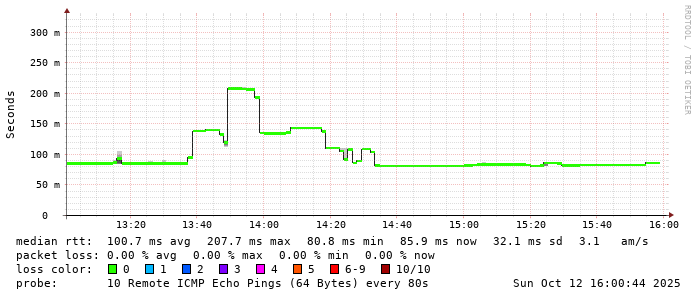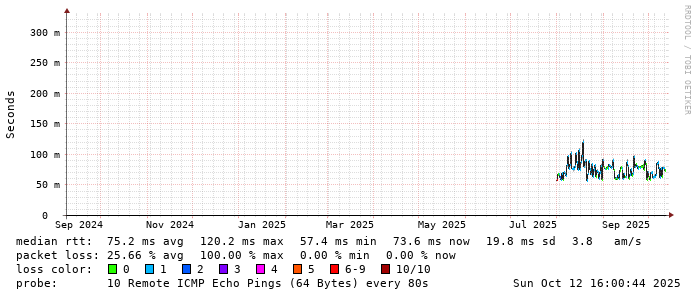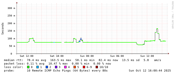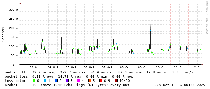 Start: 2025-10-12T04:14:40+0000HOST: ******** Loss% Snt Last Avg Best Wrst StDev 1. AS9678 103.98.75.193 0.0% 10 0.7 0.9 0.7 2.2 0.4 2. AS??? ??? 100.0 10 0.0 0.0 0.0 0.0 0.0 3. AS2914 ae-1.r25.taiptw01.tw.bb.gin.ntt.net 0.0% 10 0.6 0.8 0.5 1.1 0.2 4. AS2914 ae-10.r28.tkokhk01.hk.bb.gin.ntt.net 0.0% 10 20.4 21.3 20.4 27.4 2.2 5. AS2914 ae-20.a01.newthk04.hk.bb.gin.ntt.net 0.0% 10 54.7 54.9 54.6 55.6 0.3 6. AS2914 203.131.254.166 0.0% 10 85.0 85.0 84.9 85.0 0.1 7. AS10094 202.160.6.113 0.0% 10 82.4 82.3 82.2 82.5 0.1