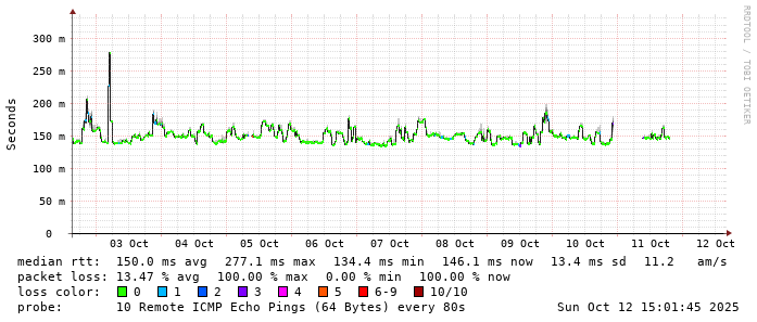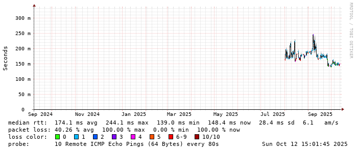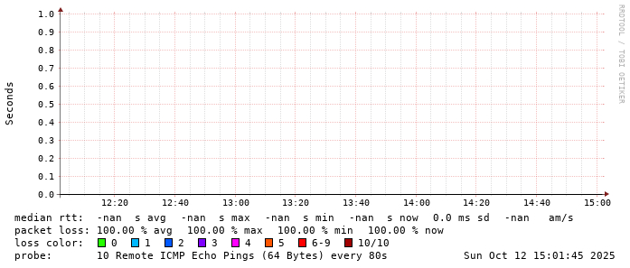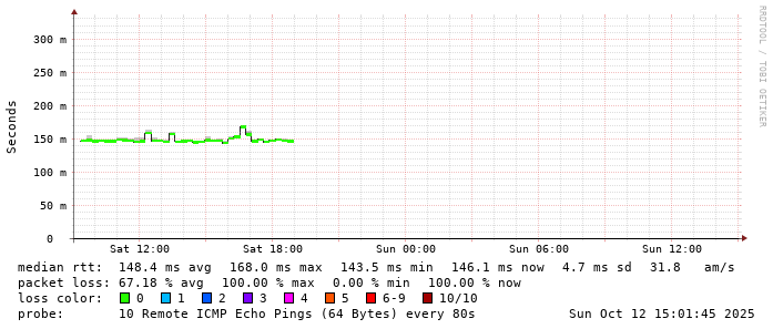 Start: 2025-10-12T04:15:16+0000HOST: ******** Loss% Snt Last Avg Best Wrst StDev 1. AS9678 103.98.75.193 0.0% 10 0.8 0.8 0.7 0.8 0.0 2. AS??? ??? 100.0 10 0.0 0.0 0.0 0.0 0.0 3. AS2914 ae-1.r25.taiptw01.tw.bb.gin.ntt.net 0.0% 10 0.6 1.0 0.5 3.5 0.9 4. AS2914 ae-4.a01.taiptw01.tw.bb.gin.ntt.net 90.0% 10 0.4 0.4 0.4 0.4 0.0 5. AS6453 ix-ae-29-0.tcore1.tj5-taipei.as6453.net 0.0% 10 0.4 0.7 0.4 1.0 0.1 6. AS6453 if-ae-7-2.tcore1.yig-taipei.as6453.net 0.0% 10 123.4 123.3 123.2 123.5 0.1 7. AS??? ??? 100.0 10 0.0 0.0 0.0 0.0 0.0 8. AS6453 if-bundle-5-2.qcore2.hk2-hongkong.as6453.net 70.0% 10 119.9 119.9 119.9 119.9 0.0 9. AS6453 if-bundle-32-2.qcore2.svw-singapore.as6453.net 90.0% 10 136.2 136.2 136.2 136.2 0.0 10. AS6453 if-bundle-34-22.qcore1.cxr-chennai.as6453.net 70.0% 10 128.3 128.3 128.1 128.6 0.2 11. AS6453 if-bundle-2-2.qcore2.cxr-chennai.as6453.net 60.0% 10 127.6 128.1 127.6 128.5 0.4 12. AS6453 if-ae-22-2.tcore2.cxr-chennai.as6453.net 0.0% 10 121.9 122.5 121.9 124.8 0.9 13. AS6453 if-ae-3-3.tcore1.cxr-chennai.as6453.net 0.0% 10 123.8 123.0 122.7 123.8 0.3 14. AS6453 if-be-10-2.ecore2.klk-kolkata.as6453.net 0.0% 10 114.2 114.2 114.0 114.3 0.1 15. AS??? ??? 100.0 10 0.0 0.0 0.0 0.0 0.0