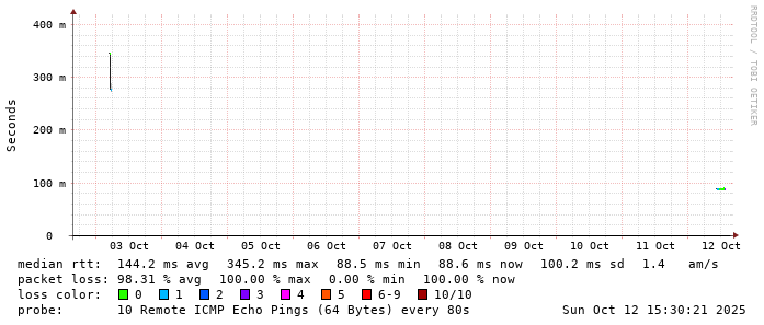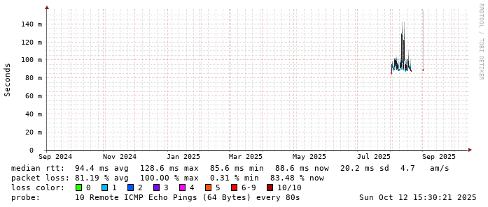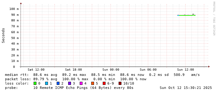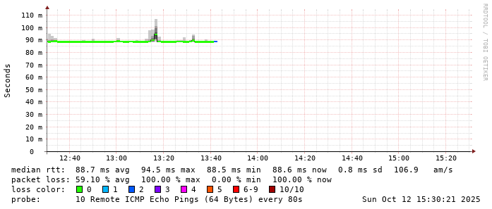 Start: 2025-10-12T04:15:33+0000HOST: ******** Loss% Snt Last Avg Best Wrst StDev 1. AS9678 103.98.75.193 0.0% 10 0.8 0.8 0.6 0.8 0.1 2. AS??? ??? 100.0 10 0.0 0.0 0.0 0.0 0.0 3. AS2914 ae-1.r25.taiptw01.tw.bb.gin.ntt.net 0.0% 10 0.9 0.8 0.6 0.9 0.1 4. AS2914 ae-10.r28.tkokhk01.hk.bb.gin.ntt.net 0.0% 10 20.5 20.5 20.3 20.9 0.2 5. AS2914 ae-18.a00.chwahk03.hk.bb.gin.ntt.net 10.0% 10 45.9 34.9 27.7 70.0 14.4 6. AS2914 203.131.243.154 90.0% 10 54.0 54.0 54.0 54.0 0.0 7. AS58453 223.120.2.117 90.0% 10 54.4 54.4 54.4 54.4 0.0 8. AS??? ??? 100.0 10 0.0 0.0 0.0 0.0 0.0 9. AS9808 221.183.89.178 90.0% 10 60.1 60.1 60.1 60.1 0.0 10. AS9808 221.183.89.33 10.0% 10 60.4 60.4 60.4 60.5 0.0 11. AS9808 221.183.89.14 80.0% 10 61.0 60.9 60.9 61.0 0.1 12. AS??? ??? 100.0 10 0.0 0.0 0.0 0.0 0.0 13. AS??? ??? 100.0 10 0.0 0.0 0.0 0.0 0.0 14. AS9808 111.13.188.45 0.0% 10 74.6 74.7 74.5 75.2 0.2 15. AS??? ??? 100.0 10 0.0 0.0 0.0 0.0 0.0 16. AS55960 54.222.31.95 0.0% 10 91.5 91.6 90.6 94.8 1.3 17. AS55960 54.222.25.81 0.0% 10 103.7 90.0 87.9 103.7 4.8 18. AS55960 54.222.25.84 0.0% 10 81.0 81.8 80.5 85.9 1.6 19. AS??? ??? 100.0 10 0.0 0.0 0.0 0.0 0.0 20. AS??? ??? 100.0 10 0.0 0.0 0.0 0.0 0.0 21. AS??? ??? 100.0 10 0.0 0.0 0.0 0.0 0.0 22. AS??? ??? 100.0 10 0.0 0.0 0.0 0.0 0.0 23. AS??? ??? 100.0 10 0.0 0.0 0.0 0.0 0.0 24. AS??? ??? 100.0 9 0.0 0.0 0.0 0.0 0.0 25. AS??? ??? 100.0 4 0.0 0.0 0.0 0.0 0.0 26. AS??? ??? 100.0 3 0.0 0.0 0.0 0.0 0.0 27. AS55960 ec2-54-223-48-68.cn-north-1.compute.amazonaws.com.cn 0.0% 2 88.6 88.6 88.6 88.6 0.0