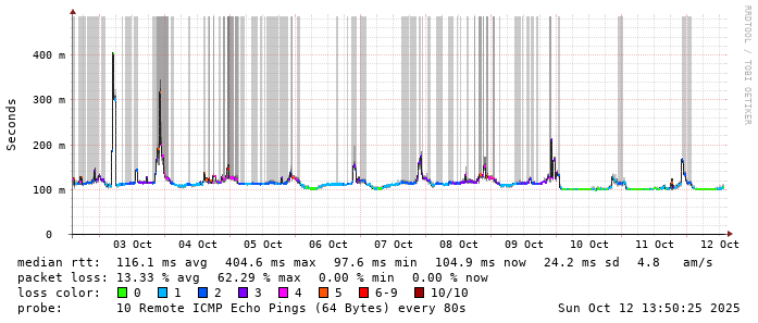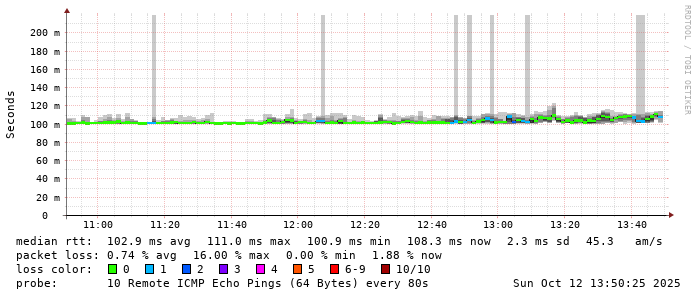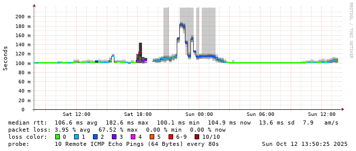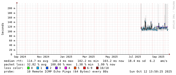 Start: 2025-10-12T04:15:56+0000HOST: ******** Loss% Snt Last Avg Best Wrst StDev 1. AS9678 103.98.75.193 0.0% 10 2.1 0.9 0.7 2.1 0.5 2. AS??? ??? 100.0 10 0.0 0.0 0.0 0.0 0.0 3. AS2914 ae-1.r25.taiptw01.tw.bb.gin.ntt.net 0.0% 10 0.7 0.8 0.5 1.1 0.2 4. AS2914 ae-10.r28.tkokhk01.hk.bb.gin.ntt.net 0.0% 10 20.6 20.7 20.5 21.2 0.2 5. AS2914 ae-18.a00.chwahk03.hk.bb.gin.ntt.net 0.0% 10 27.9 28.3 27.8 31.8 1.2 6. AS2914 203.131.243.154 90.0% 10 53.9 53.9 53.9 53.9 0.0 7. AS58453 223.120.2.117 70.0% 10 53.7 54.0 53.7 54.3 0.3 8. AS??? ??? 100.0 10 0.0 0.0 0.0 0.0 0.0 9. AS9808 221.183.55.82 0.0% 10 34.8 34.5 34.4 34.8 0.1 10. AS9808 221.183.92.21 0.0% 10 36.3 37.2 36.0 41.8 1.7 11. AS9808 221.183.89.242 80.0% 10 34.7 34.8 34.7 34.9 0.1 12. AS9808 221.183.56.146 80.0% 10 90.1 90.4 90.1 90.7 0.4 13. AS??? ??? 100.0 10 0.0 0.0 0.0 0.0 0.0 14. AS??? ??? 100.0 10 0.0 0.0 0.0 0.0 0.0 15. AS135629 52.82.192.135 0.0% 10 94.0 98.9 94.0 112.7 6.8 16. AS135629 52.82.160.67 0.0% 10 98.7 100.3 98.7 105.5 2.0 17. AS135629 52.82.160.74 0.0% 10 93.0 95.4 92.6 106.3 4.2 18. AS135629 52.82.194.241 0.0% 10 93.4 94.7 93.3 98.8 1.7 19. AS135629 52.82.194.12 0.0% 10 92.1 95.4 92.0 101.9 3.6 20. AS??? ??? 100.0 10 0.0 0.0 0.0 0.0 0.0 21. AS??? ??? 100.0 10 0.0 0.0 0.0 0.0 0.0 22. AS??? ??? 100.0 10 0.0 0.0 0.0 0.0 0.0 23. AS??? ??? 100.0 10 0.0 0.0 0.0 0.0 0.0 24. AS??? ??? 100.0 10 0.0 0.0 0.0 0.0 0.0 25. AS??? ??? 100.0 10 0.0 0.0 0.0 0.0 0.0 26. AS135629 ec2-52-83-214-0.cn-northwest-1.compute.amazonaws.com.cn 0.0% 6 101.1 103.1 101.1 106.9 2.1