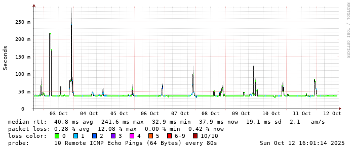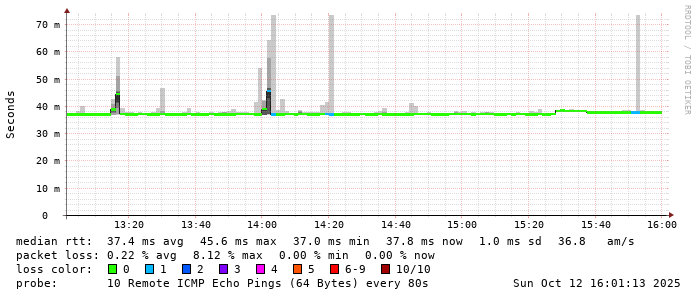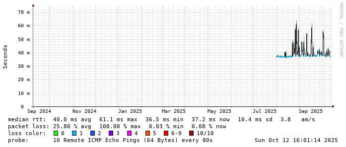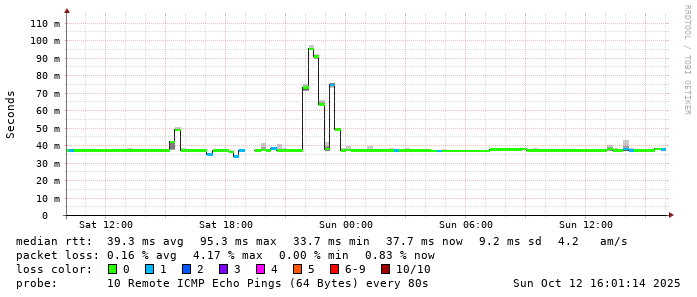 Start: 2025-10-12T04:16:54+0000HOST: ******** Loss% Snt Last Avg Best Wrst StDev 1. AS9678 103.98.75.193 0.0% 10 0.9 0.9 0.6 1.8 0.3 2. AS??? ??? 100.0 10 0.0 0.0 0.0 0.0 0.0 3. AS2914 ae-1.r25.taiptw01.tw.bb.gin.ntt.net 0.0% 10 0.6 0.7 0.5 1.2 0.2 4. AS2914 ae-10.r28.tkokhk01.hk.bb.gin.ntt.net 0.0% 10 20.6 20.5 20.4 20.6 0.1 5. AS2914 ae-18.a00.chwahk03.hk.bb.gin.ntt.net 0.0% 10 27.9 30.6 27.7 53.7 8.1 6. AS2914 203.131.243.154 80.0% 10 53.9 54.6 53.9 55.3 1.0 7. AS58453 223.120.2.117 30.0% 10 58.4 54.6 53.8 58.4 1.7 8. AS??? ??? 100.0 10 0.0 0.0 0.0 0.0 0.0 9. AS9808 221.183.55.82 0.0% 10 34.3 34.4 34.3 34.6 0.1 10. AS9808 221.183.92.21 0.0% 10 36.6 36.1 35.9 36.6 0.2 11. AS9808 221.183.89.242 30.0% 10 34.6 34.5 34.4 34.6 0.1 12. AS9808 221.183.71.78 0.0% 10 41.5 41.7 41.5 42.3 0.3 13. AS9808 221.183.110.166 20.0% 10 37.5 37.4 37.2 37.6 0.2 14. AS56040 ns3.gd.cnmobile.net 0.0% 10 38.0 37.2 37.1 38.0 0.3