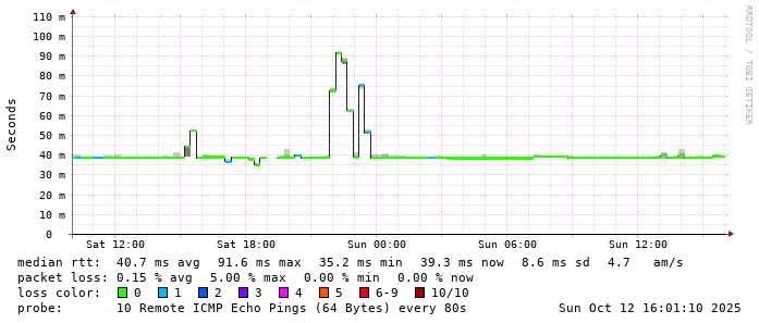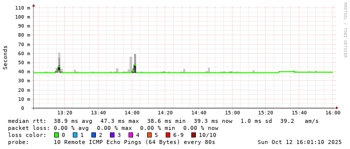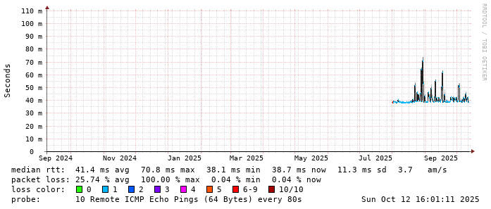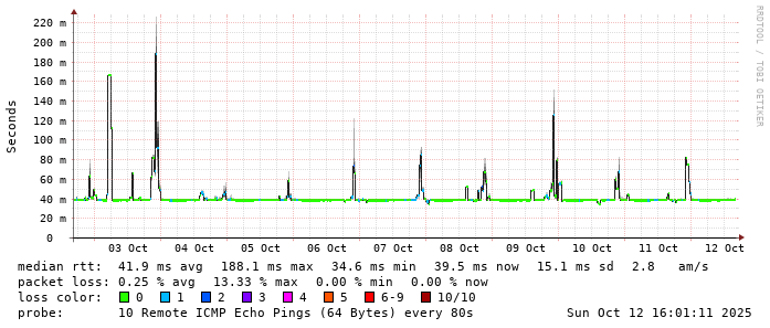 Start: 2025-10-12T04:17:11+0000HOST: ******** Loss% Snt Last Avg Best Wrst StDev 1. AS9678 103.98.75.193 0.0% 10 0.8 0.8 0.8 1.0 0.1 2. AS??? ??? 100.0 10 0.0 0.0 0.0 0.0 0.0 3. AS2914 ae-1.r25.taiptw01.tw.bb.gin.ntt.net 0.0% 10 0.5 0.6 0.5 0.8 0.1 4. AS2914 ae-10.r28.tkokhk01.hk.bb.gin.ntt.net 0.0% 10 20.5 20.6 20.5 20.8 0.1 5. AS2914 ae-18.a00.chwahk03.hk.bb.gin.ntt.net 20.0% 10 28.3 28.6 27.8 32.3 1.6 6. AS2914 203.131.243.154 80.0% 10 55.1 54.6 54.2 55.1 0.7 7. AS58453 223.120.2.117 80.0% 10 54.2 54.0 53.9 54.2 0.3 8. AS??? ??? 100.0 10 0.0 0.0 0.0 0.0 0.0 9. AS9808 221.183.55.82 0.0% 10 34.7 34.6 34.3 35.0 0.2 10. AS9808 221.183.92.21 0.0% 10 35.9 36.1 35.9 36.3 0.1 11. AS??? ??? 100.0 10 0.0 0.0 0.0 0.0 0.0 12. AS??? ??? 100.0 10 0.0 0.0 0.0 0.0 0.0 13. AS56040 211.136.208.170 10.0% 10 43.4 43.2 43.1 43.4 0.1 14. AS56040 211.136.204.121 0.0% 10 44.2 42.4 41.5 46.0 1.5 15. AS9808 120.197.29.142 0.0% 10 38.7 38.8 38.7 39.3 0.2