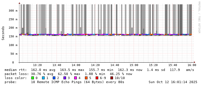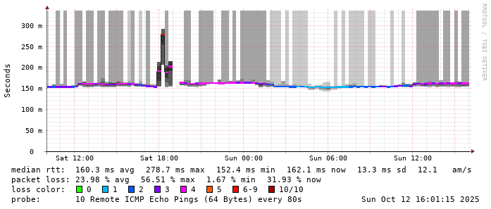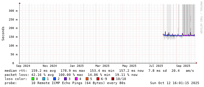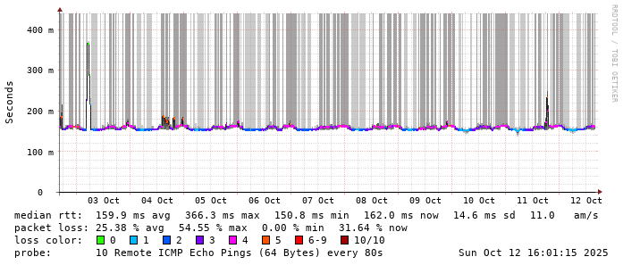 Start: 2025-10-12T04:22:18+0000HOST: ******** Loss% Snt Last Avg Best Wrst StDev 1. AS9678 103.98.75.193 0.0% 10 0.7 0.8 0.7 0.9 0.1 2. AS??? ??? 100.0 10 0.0 0.0 0.0 0.0 0.0 3. AS??? ??? 100.0 10 0.0 0.0 0.0 0.0 0.0 4. AS2914 ae-15.r33.tokyjp05.jp.bb.gin.ntt.net 80.0% 10 31.7 31.9 31.7 32.2 0.4 5. AS2914 ae-1.a03.tokyjp05.jp.bb.gin.ntt.net 0.0% 10 30.2 30.4 29.9 34.2 1.3 6. AS2914 xe-3.chinanet.tokyjp05.jp.bb.gin.ntt.net 40.0% 10 139.1 139.2 138.9 139.4 0.2 7. AS4134 202.97.94.117 10.0% 10 142.1 143.5 141.4 149.2 3.1 8. AS??? ??? 100.0 10 0.0 0.0 0.0 0.0 0.0 9. AS4134 202.97.20.70 80.0% 10 164.0 164.2 164.0 164.3 0.2 10. AS134238 59.63.236.186 30.0% 10 162.8 159.9 154.9 163.2 3.7 11. AS??? ??? 100.0 10 0.0 0.0 0.0 0.0 0.0 12. AS134238 117.41.254.98 20.0% 10 144.5 150.8 141.4 171.6 9.0 13. AS134238 117.41.182.1 30.0% 10 160.8 159.5 153.5 162.1 3.7