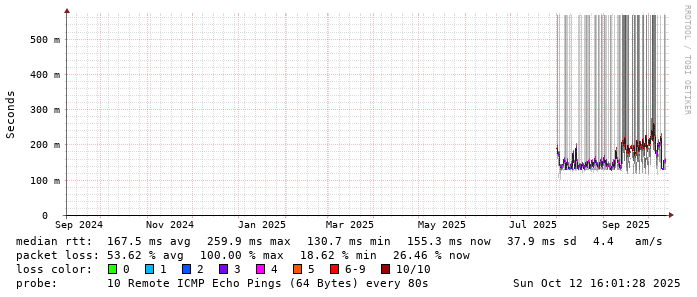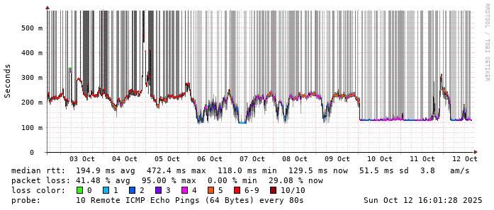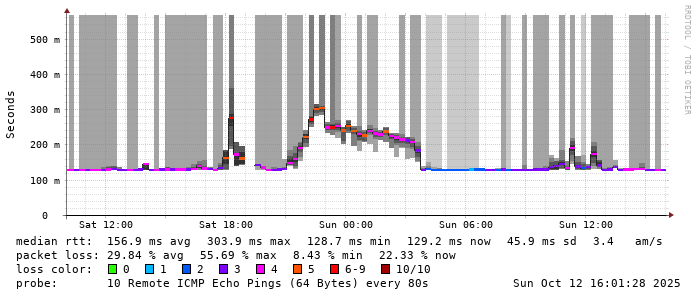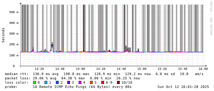 Start: 2025-10-12T04:21:22+0000HOST: ******** Loss% Snt Last Avg Best Wrst StDev 1. AS9678 103.98.75.193 0.0% 10 0.9 0.9 0.7 1.2 0.1 2. AS??? ??? 100.0 10 0.0 0.0 0.0 0.0 0.0 3. AS??? ??? 100.0 10 0.0 0.0 0.0 0.0 0.0 4. AS2914 ae-15.r33.tokyjp05.jp.bb.gin.ntt.net 70.0% 10 32.0 32.0 31.6 32.5 0.4 5. AS2914 ae-1.a03.tokyjp05.jp.bb.gin.ntt.net 0.0% 10 30.0 34.9 30.0 68.1 12.0 6. AS2914 xe-2.chinanet.tokyjp05.jp.bb.gin.ntt.net 30.0% 10 125.9 125.8 125.5 126.1 0.2 7. AS4134 202.97.12.53 40.0% 10 132.4 132.5 132.2 133.1 0.3 8. AS4134 202.97.34.73 20.0% 10 129.4 127.1 126.2 129.4 1.2 9. AS??? ??? 100.0 10 0.0 0.0 0.0 0.0 0.0 10. AS??? ??? 100.0 10 0.0 0.0 0.0 0.0 0.0 11. AS4134 121.237.2.38 50.0% 10 131.2 133.6 130.9 137.0 3.0 12. AS4134 c.center-dns.jsinfo.net 30.0% 10 149.8 173.7 138.4 207.2 27.3
