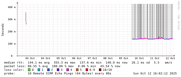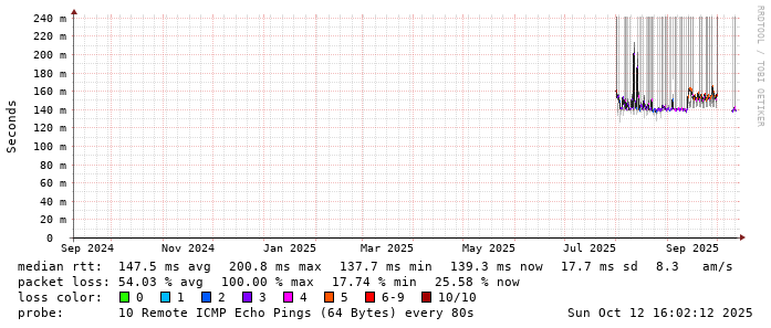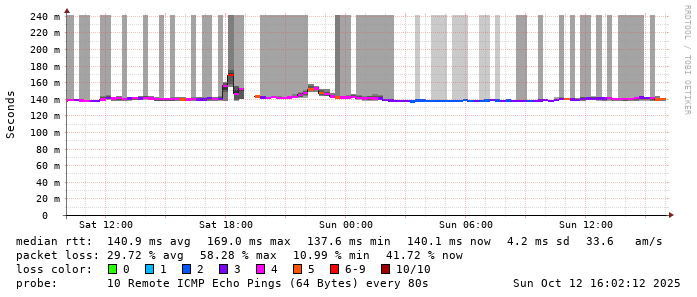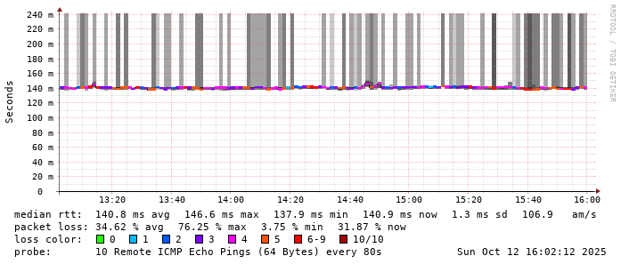 Start: 2025-10-12T04:23:54+0000HOST: ******** Loss% Snt Last Avg Best Wrst StDev 1. AS9678 103.98.75.193 0.0% 10 0.7 1.1 0.7 2.6 0.6 2. AS??? ??? 100.0 10 0.0 0.0 0.0 0.0 0.0 3. AS??? ??? 100.0 10 0.0 0.0 0.0 0.0 0.0 4. AS2914 ae-15.r33.tokyjp05.jp.bb.gin.ntt.net 80.0% 10 33.4 33.9 33.4 34.4 0.7 5. AS2914 ae-1.a03.tokyjp05.jp.bb.gin.ntt.net 0.0% 10 44.6 42.0 31.4 48.5 5.5 6. AS2914 xe-2.chinanet.tokyjp05.jp.bb.gin.ntt.net 30.0% 10 127.3 127.2 127.1 127.4 0.1 7. AS??? ??? 100.0 10 0.0 0.0 0.0 0.0 0.0 8. AS??? ??? 100.0 10 0.0 0.0 0.0 0.0 0.0 9. AS4134 41.145.149.219.dial.ty.sx.dynamic.163data.com.cn 30.0% 10 142.6 140.8 138.9 142.7 1.8