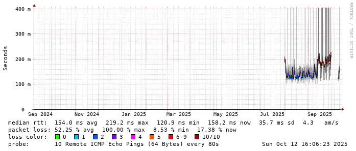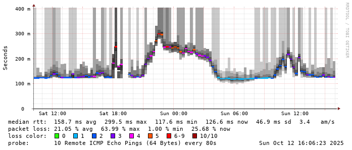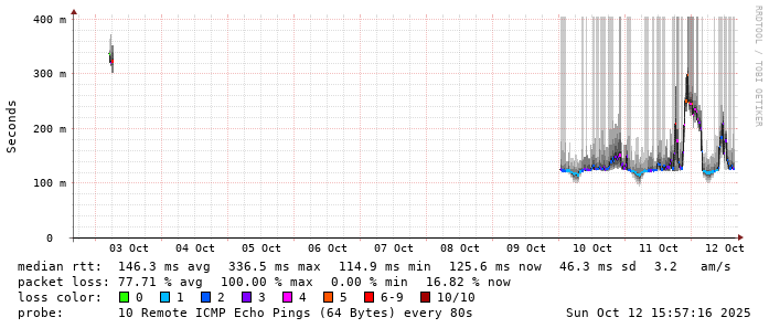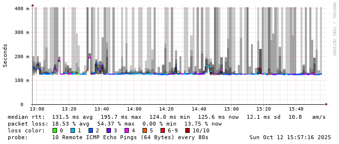 Start: 2025-10-12T04:23:15+0000HOST: ******** Loss% Snt Last Avg Best Wrst StDev 1. AS9678 103.98.75.193 0.0% 10 0.7 1.4 0.6 3.5 1.0 2. AS??? ??? 100.0 10 0.0 0.0 0.0 0.0 0.0 3. AS??? ??? 100.0 10 0.0 0.0 0.0 0.0 0.0 4. AS2914 ae-15.r33.tokyjp05.jp.bb.gin.ntt.net 60.0% 10 32.2 34.5 32.0 41.5 4.7 5. AS2914 ae-1.a03.tokyjp05.jp.bb.gin.ntt.net 0.0% 10 30.3 30.3 30.1 30.5 0.1 6. AS2914 xe-0.chinanet.tokyjp05.jp.bb.gin.ntt.net 30.0% 10 125.3 125.6 125.3 126.4 0.4 7. AS4134 202.97.39.206 90.0% 10 206.5 206.5 206.5 206.5 0.0 8. AS4134 202.97.83.90 80.0% 10 123.5 122.2 121.0 123.5 1.7 9. AS4812 101.95.120.101 40.0% 10 144.7 148.5 143.0 152.6 4.1 10. AS4812 101.95.207.230 60.0% 10 128.4 128.2 126.8 129.7 1.2 11. AS4811 101.95.209.142 30.0% 10 138.1 142.7 138.1 146.4 2.7 12. AS4812 222.73.129.1 20.0% 10 215.3 217.6 190.0 237.8 15.8