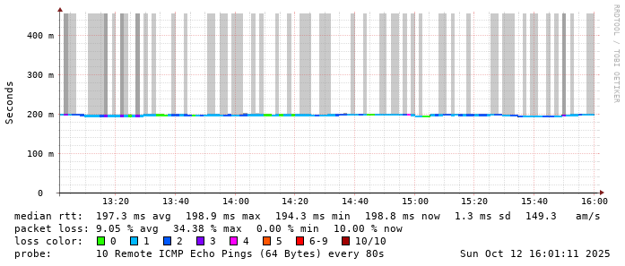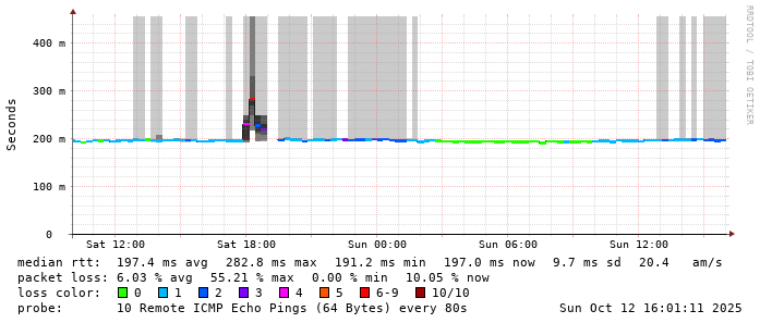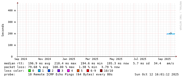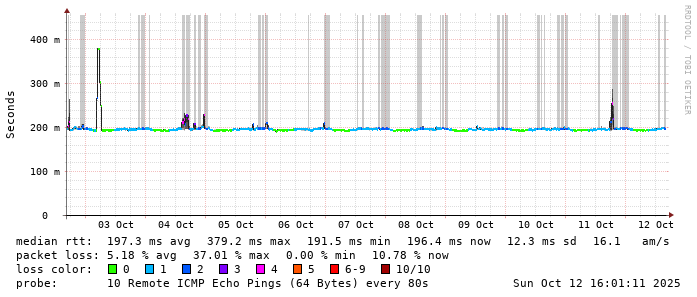 Start: 2025-10-12T04:18:59+0000HOST: ******** Loss% Snt Last Avg Best Wrst StDev 1. AS9678 103.98.75.193 0.0% 10 0.9 1.1 0.7 2.3 0.6 2. AS??? ??? 100.0 10 0.0 0.0 0.0 0.0 0.0 3. AS2914 ae-0.r24.taiptw01.tw.bb.gin.ntt.net 0.0% 10 0.6 0.7 0.4 1.1 0.2 4. AS2914 ae-15.r33.tokyjp05.jp.bb.gin.ntt.net 80.0% 10 41.9 37.0 32.0 41.9 7.0 5. AS2914 ae-4.r32.tokyjp05.jp.bb.gin.ntt.net 80.0% 10 37.8 37.1 36.3 37.8 1.0 6. AS2914 ae-4.r27.snjsca04.us.bb.gin.ntt.net 0.0% 10 133.2 133.1 133.0 133.3 0.1 7. AS2914 ae-20.a03.snjsca04.us.bb.gin.ntt.net 0.0% 10 133.2 133.1 133.0 133.2 0.1 8. AS4134 218.30.53.50 0.0% 10 157.9 160.1 156.8 163.0 2.0 9. AS4134 202.97.63.29 60.0% 10 189.3 189.3 189.2 189.3 0.1 10. AS4134 202.97.65.94 40.0% 10 188.9 188.9 188.8 189.1 0.1 11. AS4134 202.97.93.82 90.0% 10 193.0 193.0 193.0 193.0 0.0 12. AS4134 113.96.5.66 60.0% 10 197.4 196.6 193.1 198.3 2.4 13. AS4134 183.57.75.236 0.0% 10 194.0 194.5 193.9 196.5 0.8