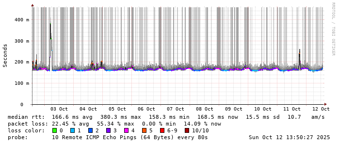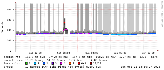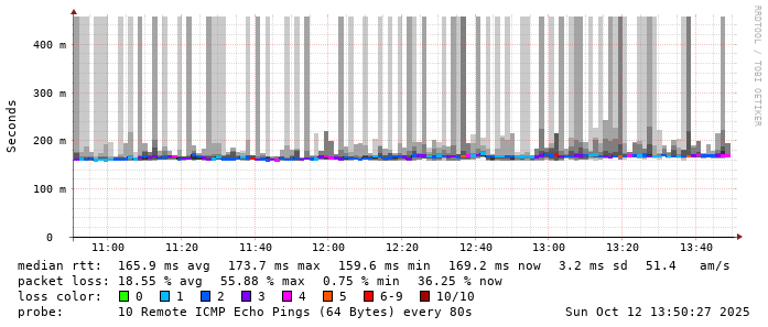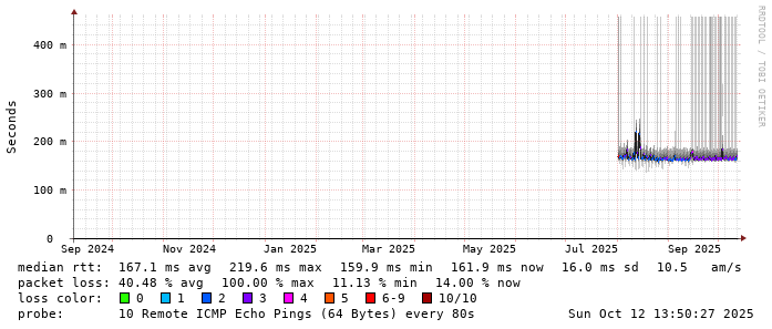 Start: 2025-10-12T04:20:01+0000HOST: ******** Loss% Snt Last Avg Best Wrst StDev 1. AS9678 103.98.75.193 0.0% 10 0.7 0.9 0.6 1.4 0.3 2. AS??? ??? 100.0 10 0.0 0.0 0.0 0.0 0.0 3. AS??? ??? 100.0 10 0.0 0.0 0.0 0.0 0.0 4. AS2914 ae-15.r33.tokyjp05.jp.bb.gin.ntt.net 60.0% 10 33.0 34.7 32.0 41.3 4.4 5. AS2914 ae-1.a03.tokyjp05.jp.bb.gin.ntt.net 0.0% 10 30.3 30.3 30.2 30.4 0.1 6. AS2914 xe-4.chinanet.tokyjp05.jp.bb.gin.ntt.net 10.0% 10 140.2 140.3 140.2 140.5 0.2 7. AS4134 202.97.12.6 80.0% 10 141.5 141.5 141.5 141.6 0.1 8. AS4134 202.97.82.61 70.0% 10 147.0 144.1 142.7 147.0 2.5 9. AS4134 202.97.62.30 0.0% 10 165.8 161.3 157.2 170.1 4.6 10. AS58519 203.195.89.118 20.0% 10 159.6 160.7 158.3 164.3 2.4 11. AS58519 203.174.4.89 90.0% 10 158.9 158.9 158.9 158.9 0.0 12. AS58519 203.174.4.94 30.0% 10 163.5 171.2 160.0 209.1 16.9