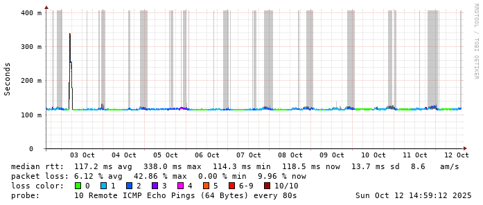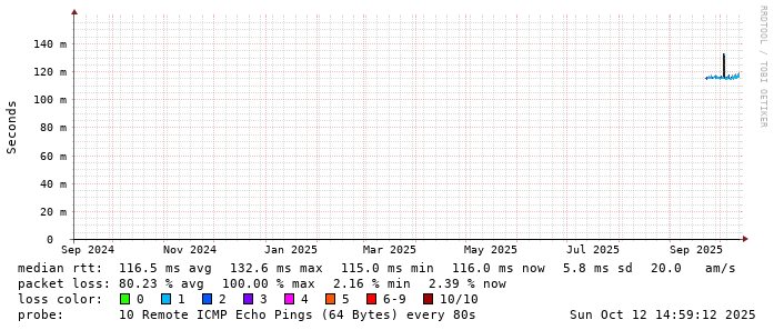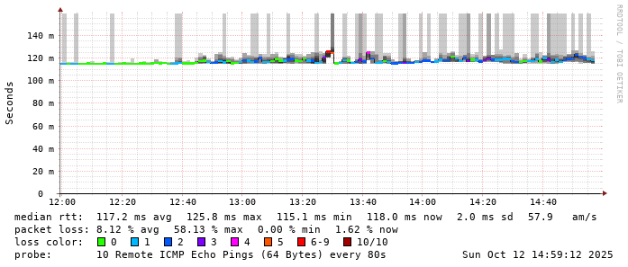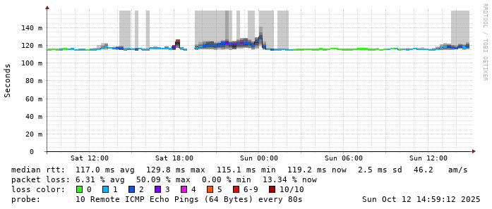 Start: 2025-10-12T04:26:56+0000HOST: ******** Loss% Snt Last Avg Best Wrst StDev 1. AS9678 103.98.75.193 0.0% 10 0.9 0.8 0.8 0.9 0.1 2. AS??? ??? 100.0 10 0.0 0.0 0.0 0.0 0.0 3. AS2914 ae-0.r24.taiptw01.tw.bb.gin.ntt.net 0.0% 10 0.6 0.6 0.5 0.8 0.1 4. AS2914 ae-15.r33.tokyjp05.jp.bb.gin.ntt.net 80.0% 10 33.2 32.4 31.5 33.2 1.2 5. AS2914 ae-1.a02.tokyjp08.jp.bb.gin.ntt.net 0.0% 10 30.8 31.1 30.5 34.0 1.0 6. AS4837 219.158.35.157 10.0% 10 94.7 94.8 94.6 94.9 0.1 7. AS4837 219.158.3.133 80.0% 10 95.7 95.7 95.6 95.7 0.0 8. AS4837 219.158.5.145 20.0% 10 96.9 98.9 96.9 110.4 4.7 9. AS4837 219.158.7.230 90.0% 10 118.4 118.4 118.4 118.4 0.0 10. AS138421 220.196.253.226 80.0% 10 119.8 119.8 119.8 119.8 0.1 11. AS17621 220.196.255.70 0.0% 10 119.8 120.0 119.5 121.1 0.5 12. AS??? ??? 100.0 10 0.0 0.0 0.0 0.0 0.0 13. AS138421 220.196.248.118 70.0% 10 117.5 118.2 117.5 119.5 1.1 14. AS17621 220.196.249.242 10.0% 10 117.7 117.8 117.7 117.8 0.0 15. AS??? ??? 100.0 10 0.0 0.0 0.0 0.0 0.0 16. AS138421 112.64.32.244 0.0% 10 115.1 115.1 115.0 115.3 0.1
