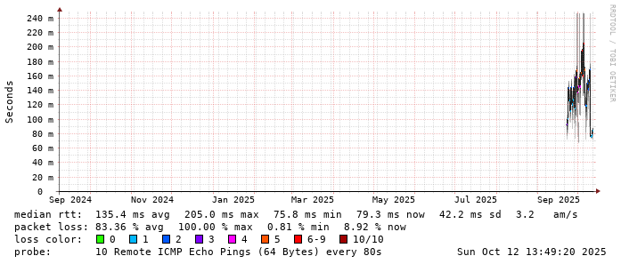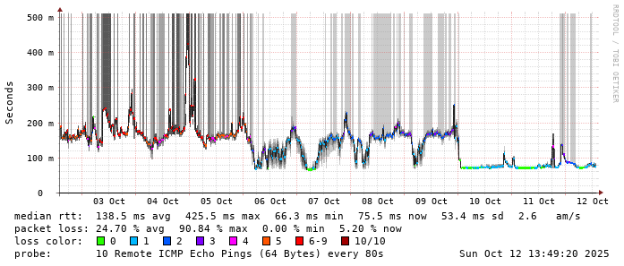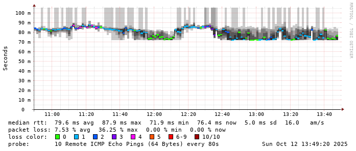 Start: 2025-10-12T04:29:38+0000HOST: ******** Loss% Snt Last Avg Best Wrst StDev 1. AS9678 103.98.75.193 0.0% 10 0.9 0.8 0.7 1.0 0.1 2. AS??? ??? 100.0 10 0.0 0.0 0.0 0.0 0.0 3. AS2914 ae-1.r25.taiptw01.tw.bb.gin.ntt.net 0.0% 10 0.5 0.7 0.5 0.9 0.2 4. AS2914 ae-10.r28.tkokhk01.hk.bb.gin.ntt.net 0.0% 10 20.7 20.6 20.5 20.9 0.1 5. AS2914 ae-18.a00.chwahk03.hk.bb.gin.ntt.net 0.0% 10 28.5 30.8 27.8 55.8 8.8 6. AS??? ??? 100.0 10 0.0 0.0 0.0 0.0 0.0 7. AS58453 223.120.2.117 60.0% 10 54.0 54.0 53.9 54.1 0.1 8. AS??? ??? 100.0 10 0.0 0.0 0.0 0.0 0.0 9. AS9808 221.183.55.82 0.0% 10 34.5 34.5 34.4 34.7 0.1 10. AS9808 221.183.92.21 0.0% 10 36.1 36.1 36.0 36.5 0.2 11. AS9808 221.183.89.242 60.0% 10 34.6 34.7 34.6 34.8 0.1 12. AS??? ??? 100.0 10 0.0 0.0 0.0 0.0 0.0 13. AS9808 221.183.53.226 80.0% 10 64.0 67.1 64.0 70.3 4.5 14. AS24400 . 60.0% 10 64.3 64.3 64.2 64.3 0.1 15. AS??? ??? 100.0 10 0.0 0.0 0.0 0.0 0.0 16. AS??? ??? 100.0 10 0.0 0.0 0.0 0.0 0.0 17. AS??? ??? 100.0 10 0.0 0.0 0.0 0.0 0.0 18. AS59078 139.198.176.226 30.0% 10 80.2 83.8 80.2 86.3 1.8
