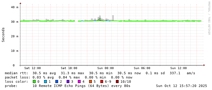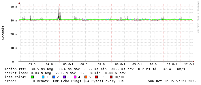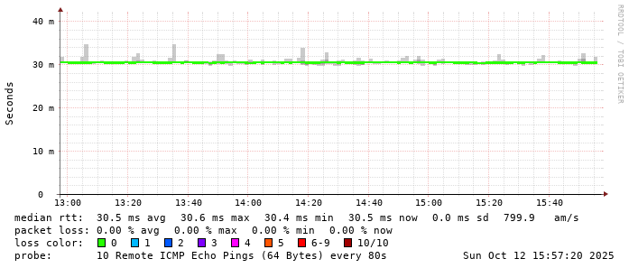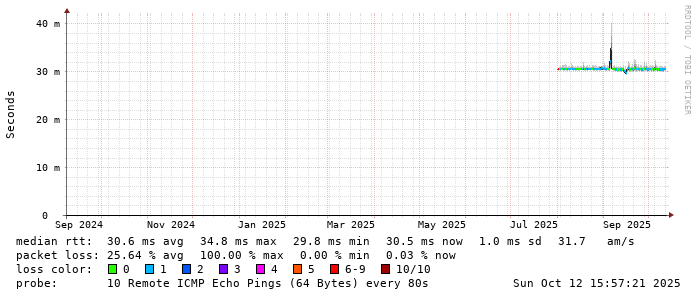 Start: 2025-10-12T04:31:59+0000HOST: ******** Loss% Snt Last Avg Best Wrst StDev 1. AS9678 103.98.75.193 0.0% 10 0.7 1.1 0.7 2.3 0.6 2. AS??? tw52.as9678.net 0.0% 10 1.2 1.3 1.1 1.8 0.2 3. AS??? ??? 100.0 10 0.0 0.0 0.0 0.0 0.0 4. AS3491 HundredGE0-1-0-0.br03.hkg08.as3491.net 0.0% 10 29.1 29.3 29.0 29.8 0.3 5. AS3491 HundredGE0-1-0-0.br03.hkg08.as3491.net 0.0% 10 28.8 29.1 28.8 29.9 0.4 6. AS3491 63-217-66-82.static.as3491.net 60.0% 10 29.3 29.4 29.3 29.4 0.0 7. AS4760 wtsc4a053.netvigator.com 0.0% 10 36.6 30.5 28.7 38.3 3.7 8. AS??? ??? 100.0 10 0.0 0.0 0.0 0.0 0.0 9. AS??? ??? 100.0 10 0.0 0.0 0.0 0.0 0.0 10. AS??? ??? 100.0 10 0.0 0.0 0.0 0.0 0.0 11. AS4760 eclass.taknga.edu.hk 0.0% 10 30.5 30.5 30.4 30.6 0.1