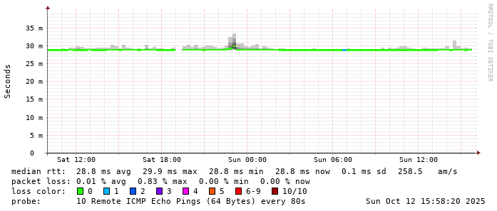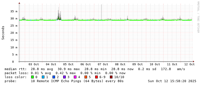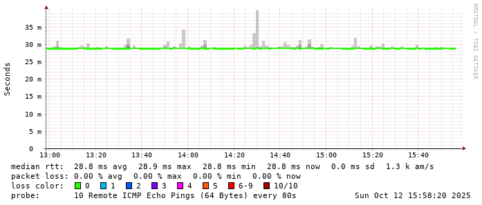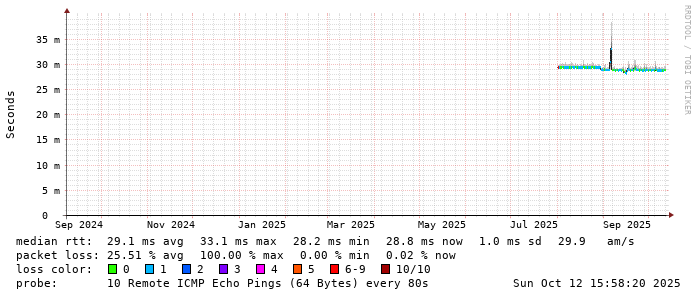 Start: 2025-10-12T04:32:16+0000HOST: ******** Loss% Snt Last Avg Best Wrst StDev 1. AS9678 103.98.75.193 0.0% 10 0.9 0.8 0.7 0.9 0.0 2. AS??? tw52.as9678.net 0.0% 10 1.0 1.1 0.9 2.0 0.3 3. AS??? ??? 100.0 10 0.0 0.0 0.0 0.0 0.0 4. AS3491 BE40.br07.hkg05.as3491.net 0.0% 10 29.1 29.1 28.9 29.1 0.1 5. AS3491 hkt.be10.10.br07.hkg05.as3491.net 0.0% 10 23.5 22.0 21.7 23.5 0.5 6. AS??? ??? 100.0 10 0.0 0.0 0.0 0.0 0.0 7. AS4760 wtsc3a069.netvigator.com 0.0% 10 29.0 29.0 28.9 29.1 0.1 8. AS4760 218.102.21.54 0.0% 10 28.9 41.7 28.9 155.4 40.0 9. AS4760 205.252.144.228 0.0% 10 29.2 28.9 28.9 29.2 0.1