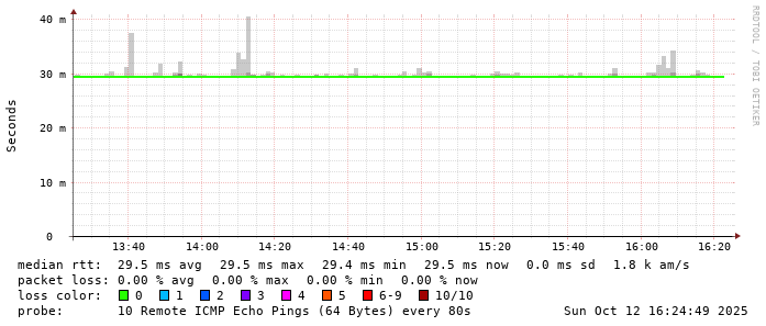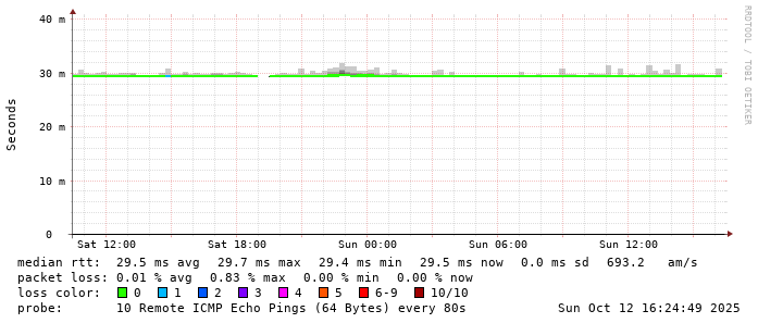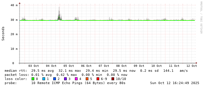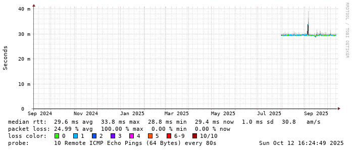 Start: 2025-10-12T04:32:33+0000HOST: ******** Loss% Snt Last Avg Best Wrst StDev 1. AS9678 103.98.75.193 0.0% 10 0.7 1.1 0.6 2.6 0.6 2. AS??? tw52.as9678.net 0.0% 10 1.1 1.2 1.0 1.8 0.2 3. AS??? ??? 100.0 10 0.0 0.0 0.0 0.0 0.0 4. AS3491 HundredGE0-2-0-0.br05.hkg05.as3491.net 0.0% 10 29.5 29.4 29.1 30.7 0.5 5. AS3491 netvigator.hu0-4-0-1.br05.hkg05.as3491.net 10.0% 10 29.6 30.3 29.4 35.3 1.9 6. AS4760 n219078131254.netvigator.com 0.0% 10 29.5 29.6 29.4 29.8 0.1