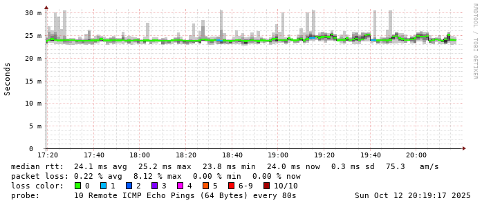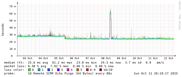 Start: 2025-10-12T04:32:48+0000HOST: ******** Loss% Snt Last Avg Best Wrst StDev 1. AS9678 103.98.75.193 0.0% 10 2.1 0.9 0.7 2.1 0.4 2. AS??? tw52.as9678.net 0.0% 10 1.1 1.4 1.0 3.2 0.7 3. AS??? ??? 100.0 10 0.0 0.0 0.0 0.0 0.0 4. AS3491 HundredGE0-3-0-1.br01.tap04.as3491.net 0.0% 10 0.8 1.0 0.8 1.1 0.1 5. AS3491 63-222-40-10.static.as3491.net 0.0% 10 1.1 1.2 1.1 1.6 0.2 6. AS4637 i-1078.tpei-core02.telstraglobal.net 0.0% 10 1.2 1.5 0.8 2.6 0.7 7. AS4637 i-1087.hkck-core01.telstraglobal.net 0.0% 10 21.3 22.5 21.3 23.4 0.7 8. AS4637 i-0-5-0-5.hkth12.telstraglobal.net 0.0% 10 14.9 14.7 14.6 14.9 0.1 9. AS4637 unknown.telstraglobal.net 0.0% 10 14.7 14.9 14.7 15.3 0.2 10. AS??? ??? 100.0 10 0.0 0.0 0.0 0.0 0.0 11. AS4637 unknown.telstraglobal.net 0.0% 10 23.9 23.9 23.3 24.3 0.2