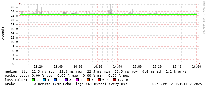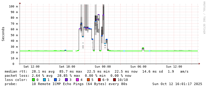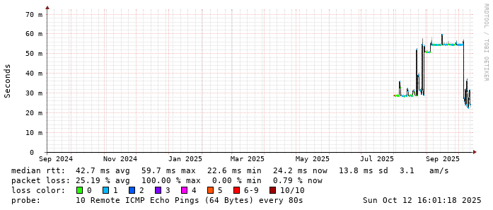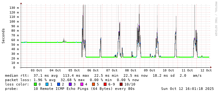 Start: 2025-10-12T04:30:51+0000HOST: ******** Loss% Snt Last Avg Best Wrst StDev 1. AS9678 103.98.75.193 0.0% 10 0.7 0.8 0.7 1.0 0.1 2. AS??? tw52.as9678.net 0.0% 10 1.1 1.1 1.0 1.7 0.2 3. AS??? ??? 100.0 10 0.0 0.0 0.0 0.0 0.0 4. AS58453 223.118.6.38 0.0% 10 1.0 1.2 1.0 1.3 0.1 5. AS58453 223.118.5.137 0.0% 10 3.7 3.7 3.5 3.7 0.1 6. AS58453 223.120.2.118 90.0% 10 56.0 56.0 56.0 56.0 0.0 7. AS??? i3dnet2-lacp-100g.hkix.net 0.0% 10 22.6 23.8 22.4 34.6 3.8 8. AS49544 hosted-by.i3d.net 0.0% 10 22.6 22.6 22.5 22.6 0.0