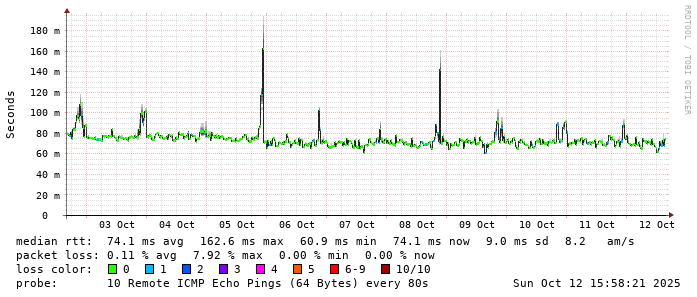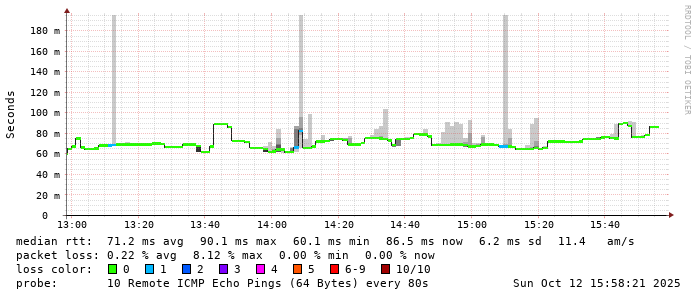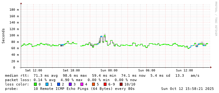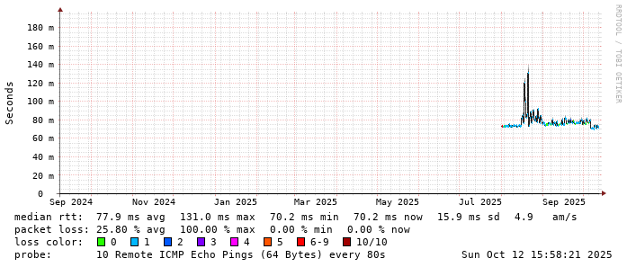 Start: 2025-10-12T04:34:14+0000HOST: ******** Loss% Snt Last Avg Best Wrst StDev 1. AS9678 103.98.75.193 0.0% 10 0.8 1.1 0.7 2.1 0.6 2. AS??? ??? 100.0 10 0.0 0.0 0.0 0.0 0.0 3. AS2914 ae-1.r25.taiptw01.tw.bb.gin.ntt.net 0.0% 10 0.6 0.6 0.4 0.9 0.2 4. AS2914 ae-4.r28.tkokhk01.hk.bb.gin.ntt.net 0.0% 10 13.5 14.5 13.4 21.1 2.4 5. AS2914 ae-3.r29.tkokhk01.hk.bb.gin.ntt.net 0.0% 10 13.6 13.6 13.3 14.0 0.2 6. AS2914 ae-6.r24.sngpsi07.sg.bb.gin.ntt.net 30.0% 10 57.3 57.3 57.2 57.3 0.0 7. AS2914 ae-0.a01.sngpsi08.sg.bb.gin.ntt.net 0.0% 10 45.9 45.9 45.7 46.2 0.2 8. AS2914 ae-2-50.a01.sngpsi08.sg.ce.gin.ntt.net 0.0% 10 46.5 46.4 46.1 47.0 0.3 9. AS??? 114-0-124-70.resources.indosat.com 0.0% 10 58.5 58.4 58.2 59.0 0.2 10. AS4761 114-4-124-5.resources.indosat.com 0.0% 10 59.4 59.7 59.2 62.2 1.0 11. AS4761 ns2.indosat.com 0.0% 10 57.9 58.1 57.7 60.1 0.7
