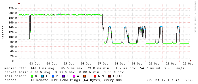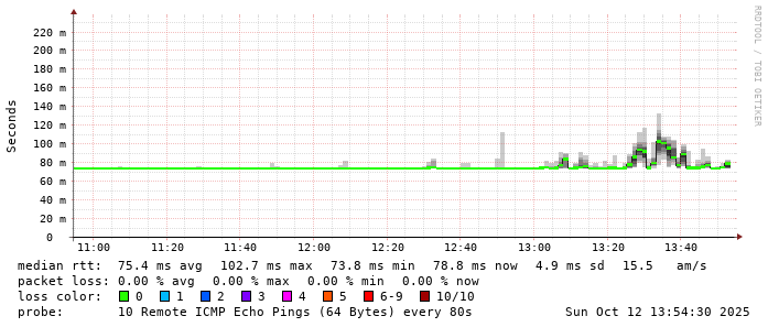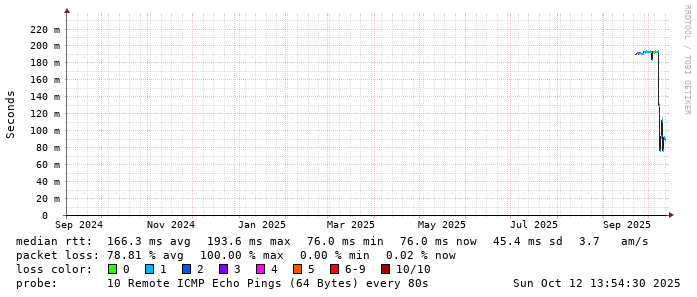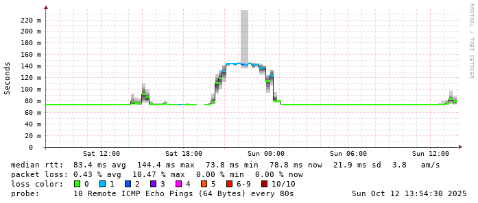 Start: 2025-10-12T04:35:21+0000HOST: ******** Loss% Snt Last Avg Best Wrst StDev 1. AS9678 103.98.75.193 0.0% 10 1.4 0.9 0.7 1.8 0.4 2. AS??? tw52.as9678.net 0.0% 10 1.1 1.1 1.0 1.3 0.1 3. AS??? ??? 100.0 10 0.0 0.0 0.0 0.0 0.0 4. AS3491 HundredGE0-0-0-0.br05.hkg15.as3491.net 0.0% 10 30.1 28.7 28.0 30.8 1.1 5. AS6939 e0-68.core2.hkg1.he.net 60.0% 10 21.1 22.1 21.1 23.4 1.0 6. AS??? ??? 100.0 10 0.0 0.0 0.0 0.0 0.0 7. AS??? ??? 100.0 10 0.0 0.0 0.0 0.0 0.0 8. AS6939 moratel-international-pte-ltd.e0-57.core2.sin1.he.net 0.0% 10 62.7 61.7 61.4 62.7 0.4 9. AS??? ip-103-83-6-22.moratelindo.net.id 0.0% 10 74.5 75.2 74.5 77.7 1.0 10. AS??? ip-103-83-6-22.moratelindo.net.id 0.0% 10 74.2 74.3 74.0 74.6 0.2 11. AS??? 103.78.99.154 0.0% 10 67.4 67.0 66.7 67.4 0.2 12. AS131111 bwtest.moratelindo.co.id 0.0% 10 74.0 74.0 73.9 74.4 0.2