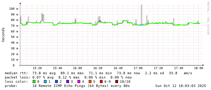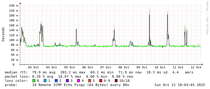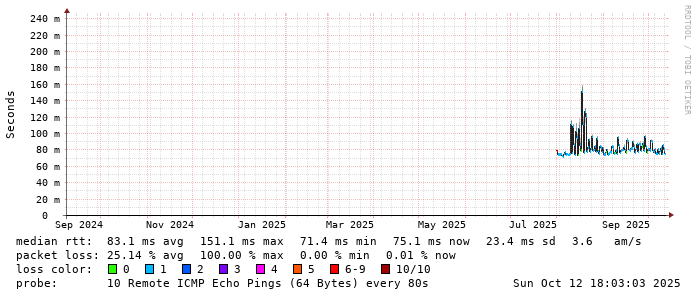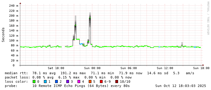 Start: 2025-10-12T04:36:09+0000HOST: ******** Loss% Snt Last Avg Best Wrst StDev 1. AS9678 103.98.75.193 0.0% 10 0.9 0.8 0.7 1.2 0.1 2. AS??? ??? 100.0 10 0.0 0.0 0.0 0.0 0.0 3. AS2914 ae-1.r25.taiptw01.tw.bb.gin.ntt.net 0.0% 10 0.5 0.6 0.4 0.8 0.1 4. AS2914 ae-10.r28.tkokhk01.hk.bb.gin.ntt.net 0.0% 10 38.4 22.3 20.5 38.4 5.6 5. AS2914 ae-3.r29.tkokhk01.hk.bb.gin.ntt.net 0.0% 10 20.5 20.6 20.5 21.0 0.1 6. AS2914 ae-6.r24.sngpsi07.sg.bb.gin.ntt.net 20.0% 10 67.0 67.2 66.9 68.5 0.5 7. AS2914 ae-15.a03.sngpsi07.sg.bb.gin.ntt.net 0.0% 10 66.9 66.9 66.8 67.1 0.1 8. AS2914 ae-0.fiberstar.sngpsi07.sg.bb.gin.ntt.net 0.0% 10 67.6 67.7 67.6 68.0 0.1 9. AS136106 ip187-93.fiberstar.net.id 0.0% 10 72.3 72.0 71.8 72.3 0.2 10. AS136106 ip184-162.fiberstar.net.id 0.0% 10 74.7 74.9 74.6 75.3 0.2 11. AS63859 host-158.140.187-50.myrepublic.co.id 0.0% 10 73.8 73.8 73.8 73.9 0.0