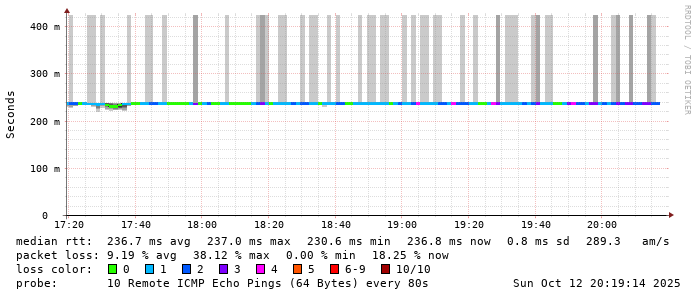 Start: 2025-10-12T04:37:21+0000HOST: ******** Loss% Snt Last Avg Best Wrst StDev 1. AS9678 103.98.75.193 0.0% 10 0.8 0.9 0.7 1.9 0.4 2. AS??? tw52.as9678.net 0.0% 10 1.8 1.2 1.0 1.8 0.3 3. AS??? ??? 100.0 10 0.0 0.0 0.0 0.0 0.0 4. AS3491 Hu0-0-0-0.br03.tap04.as3491.net 10.0% 10 0.7 0.8 0.7 1.0 0.1 5. AS6453 ix-ae-27-0.tcore1.tj5-taipei.as6453.net 0.0% 10 0.8 1.3 0.5 5.0 1.5 6. AS6453 if-ae-7-2.tcore1.yig-taipei.as6453.net 0.0% 10 59.2 59.3 59.1 59.5 0.1 7. AS??? ??? 100.0 10 0.0 0.0 0.0 0.0 0.0 8. AS6453 if-bundle-5-2.qcore2.hk2-hongkong.as6453.net 70.0% 10 63.0 63.1 62.7 63.6 0.5 9. AS6453 if-bundle-32-2.qcore2.svw-singapore.as6453.net 90.0% 10 57.9 57.9 57.9 57.9 0.0 10. AS7713 125.160.9.146 0.0% 10 198.6 198.8 198.6 199.9 0.4 11. AS7713 110.139.32.1 0.0% 10 199.0 199.1 198.9 199.7 0.3