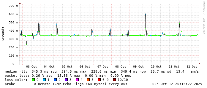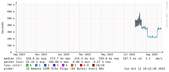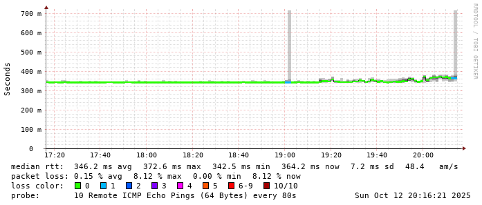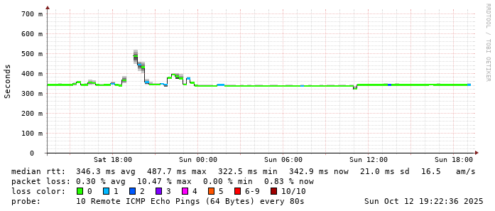 Start: 2025-10-12T04:38:11+0000HOST: ******** Loss% Snt Last Avg Best Wrst StDev 1. AS9678 103.98.75.193 0.0% 10 0.7 1.0 0.6 2.1 0.5 2. AS??? ??? 100.0 10 0.0 0.0 0.0 0.0 0.0 3. AS2914 ae-1.r25.taiptw01.tw.bb.gin.ntt.net 0.0% 10 0.4 0.6 0.4 0.8 0.1 4. AS2914 ae-10.r28.tkokhk01.hk.bb.gin.ntt.net 0.0% 10 20.7 20.5 20.4 20.7 0.1 5. AS2914 ae-18.a00.chwahk03.hk.bb.gin.ntt.net 10.0% 10 32.1 31.7 27.8 38.9 3.9 6. AS2914 ae-0.telecom-italia.chwahk03.hk.bb.gin.ntt.net 0.0% 10 29.9 41.3 28.3 75.3 14.3 7. AS6762 213.144.170.113 0.0% 10 204.0 203.9 203.4 204.9 0.6 8. AS6762 213.144.170.109 0.0% 10 342.7 345.8 342.2 374.2 10.0 9. AS45558 203.215.61.33 0.0% 10 334.6 335.2 334.6 338.0 1.0 10. AS45558 203.215.60.66 0.0% 10 342.3 342.6 342.3 342.9 0.2 11. AS136221 150.129.162.5 0.0% 10 342.4 343.7 342.3 349.1 2.2