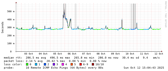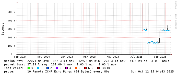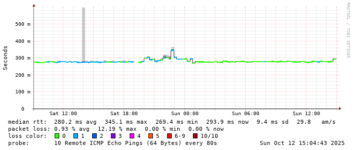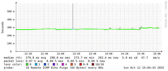 Start: 2025-10-12T04:41:02+0000HOST: ******** Loss% Snt Last Avg Best Wrst StDev 1. AS9678 103.98.75.193 0.0% 10 0.8 0.8 0.7 1.0 0.1 2. AS??? ??? 100.0 10 0.0 0.0 0.0 0.0 0.0 3. AS2914 ae-1.r25.taiptw01.tw.bb.gin.ntt.net 0.0% 10 1.1 0.7 0.5 1.1 0.2 4. AS2914 ae-10.r28.tkokhk01.hk.bb.gin.ntt.net 0.0% 10 20.7 20.9 20.5 22.6 0.6 5. AS2914 ae-3.r29.tkokhk01.hk.bb.gin.ntt.net 0.0% 10 20.5 20.6 20.4 20.8 0.1 6. AS2914 ae-6.r24.sngpsi07.sg.bb.gin.ntt.net 20.0% 10 71.6 71.7 71.6 71.9 0.1 7. AS2914 ae-4.a02.sngpsi07.sg.bb.gin.ntt.net 0.0% 10 71.6 71.3 68.7 71.6 0.9 8. AS2914 ae-1.bharti.sngpsi07.sg.bb.gin.ntt.net 0.0% 10 60.0 62.3 60.0 71.2 4.6 9. AS9498 116.119.106.34 0.0% 10 280.4 280.5 280.2 282.1 0.6 10. AS24560 abts-north-static-001.40.160.122.airtelbroadband.in 0.0% 10 281.1 281.3 281.1 283.0 0.6