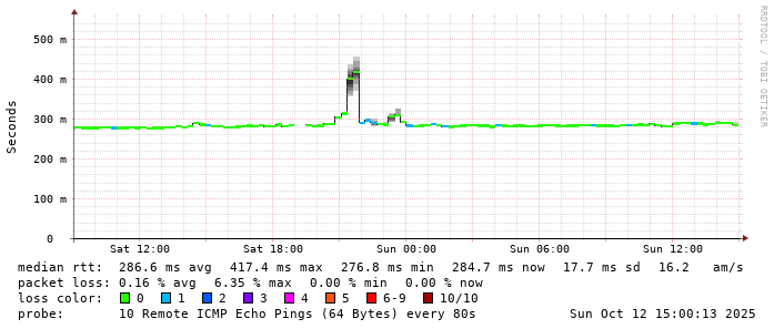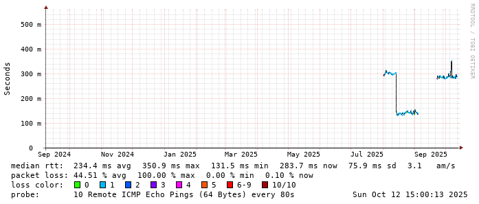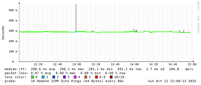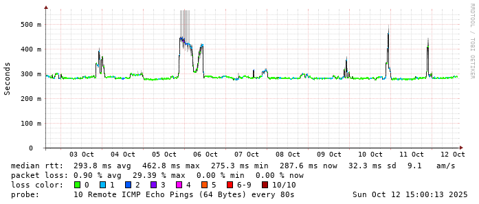 Start: 2025-10-12T04:40:40+0000HOST: ******** Loss% Snt Last Avg Best Wrst StDev 1. AS9678 103.98.75.193 0.0% 10 0.8 0.7 0.6 0.9 0.1 2. AS??? ??? 100.0 10 0.0 0.0 0.0 0.0 0.0 3. AS2914 ae-1.r25.taiptw01.tw.bb.gin.ntt.net 0.0% 10 0.5 0.7 0.4 1.0 0.2 4. AS2914 ae-10.r28.tkokhk01.hk.bb.gin.ntt.net 0.0% 10 20.5 20.6 20.4 20.8 0.1 5. AS2914 ae-3.r29.tkokhk01.hk.bb.gin.ntt.net 0.0% 10 20.4 20.5 20.4 20.7 0.1 6. AS2914 ae-6.r24.sngpsi07.sg.bb.gin.ntt.net 30.0% 10 68.9 68.9 68.7 69.0 0.1 7. AS2914 ae-15.a03.sngpsi07.sg.bb.gin.ntt.net 0.0% 10 68.7 68.8 68.7 69.0 0.1 8. AS2914 ae-0.bharti.sngpsi07.sg.bb.gin.ntt.net 0.0% 10 65.1 65.2 64.9 66.6 0.5 9. AS??? 116.119.161.114 0.0% 10 277.0 277.0 276.8 277.5 0.2 10. AS9498 nsg-static-201.53.71.182.airtel.in 0.0% 10 289.4 289.3 289.0 289.5 0.2