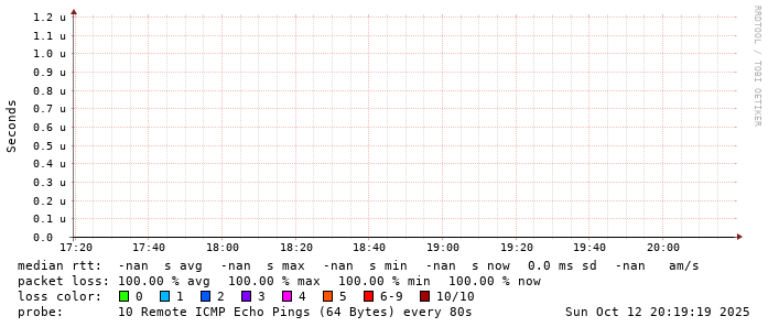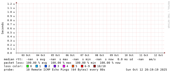 Start: 2025-10-12T04:43:54+0000HOST: ******** Loss% Snt Last Avg Best Wrst StDev 1. AS9678 103.98.75.193 0.0% 10 0.9 1.0 0.7 1.9 0.4 2. AS??? ??? 100.0 10 0.0 0.0 0.0 0.0 0.0 3. AS2914 ae-0.r24.taiptw01.tw.bb.gin.ntt.net 0.0% 10 0.7 0.7 0.5 1.0 0.2 4. AS2914 ae-15.r33.tokyjp05.jp.bb.gin.ntt.net 70.0% 10 34.2 34.2 33.4 35.1 0.8 5. AS??? ??? 100.0 10 0.0 0.0 0.0 0.0 0.0 6. AS2914 ae-5.r26.sttlwa01.us.bb.gin.ntt.net 0.0% 10 117.2 117.3 117.1 117.7 0.2 7. AS2914 ae-11.r22.nwrknj03.us.bb.gin.ntt.net 0.0% 10 186.5 186.5 186.3 186.8 0.1 8. AS2914 ae-0.a02.nycmny17.us.bb.gin.ntt.net 0.0% 10 188.2 184.5 182.8 192.5 3.3 9. AS2914 ae-0.reliance-jio-infocomm.nycmny17.us.bb.gin.ntt.net 0.0% 10 189.6 190.1 189.6 192.3 0.8 10. AS64049 103.198.140.28 0.0% 10 378.6 378.6 378.5 378.8 0.1 11. AS64049 49.45.4.252 0.0% 10 381.6 383.1 381.3 389.7 3.3 12. AS??? ??? 100.0 10 0.0 0.0 0.0 0.0 0.0