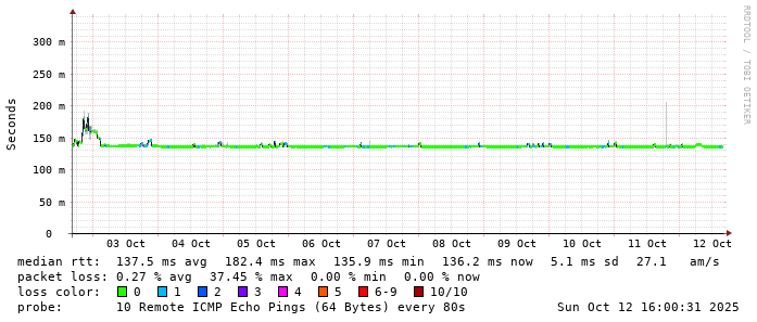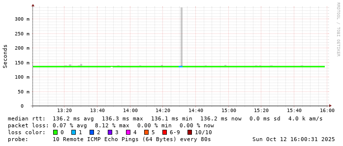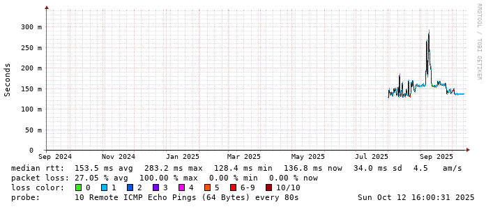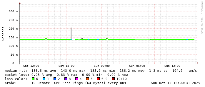 Start: 2025-10-12T04:45:04+0000HOST: ******** Loss% Snt Last Avg Best Wrst StDev 1. AS9678 103.98.75.193 0.0% 10 0.7 1.1 0.7 2.3 0.6 2. AS??? ??? 100.0 10 0.0 0.0 0.0 0.0 0.0 3. AS2914 ae-1.r25.taiptw01.tw.bb.gin.ntt.net 0.0% 10 0.9 0.6 0.5 0.9 0.1 4. AS2914 ae-4.a01.taiptw01.tw.bb.gin.ntt.net 90.0% 10 0.4 0.4 0.4 0.4 0.0 5. AS6453 ix-ae-29-0.tcore1.tj5-taipei.as6453.net 0.0% 10 1.1 0.9 0.5 2.0 0.4 6. AS6453 if-ae-7-2.tcore1.yig-taipei.as6453.net 0.0% 10 63.0 63.7 63.0 68.2 1.6 7. AS6453 if-bundle-6-2.qcore1.hk2-hongkong.as6453.net 90.0% 10 62.0 62.0 62.0 62.0 0.0 8. AS6453 if-bundle-5-2.qcore2.hk2-hongkong.as6453.net 70.0% 10 62.0 61.8 61.8 62.0 0.1 9. AS6453 if-bundle-32-2.qcore2.svw-singapore.as6453.net 90.0% 10 63.0 63.0 63.0 63.0 0.0 10. AS6453 if-ae-33-2.tcore2.svw-singapore.as6453.net 0.0% 10 62.3 62.5 62.3 63.2 0.3 11. AS6453 180.87.15.202 0.0% 10 131.9 132.0 131.9 132.1 0.1 12. AS??? ??? 100.0 10 0.0 0.0 0.0 0.0 0.0 13. AS??? ??? 100.0 10 0.0 0.0 0.0 0.0 0.0 14. AS??? ??? 100.0 10 0.0 0.0 0.0 0.0 0.0 15. AS??? ??? 100.0 10 0.0 0.0 0.0 0.0 0.0 16. AS17762 static-1.73.248.49-tataidc.co.in 0.0% 10 136.2 136.2 136.2 136.3 0.1