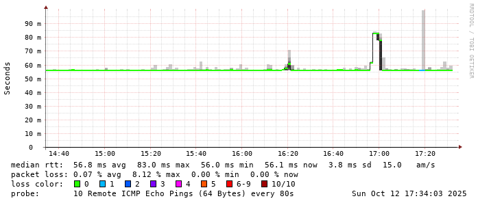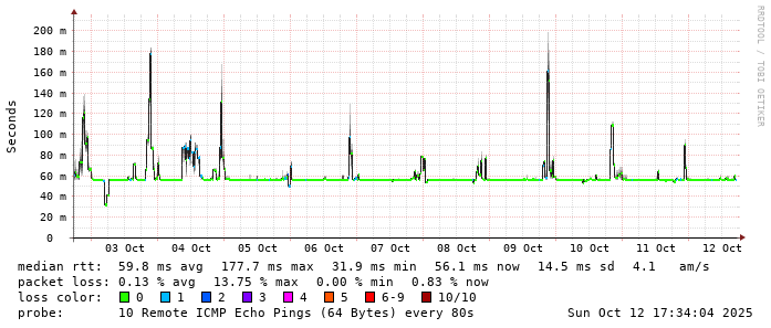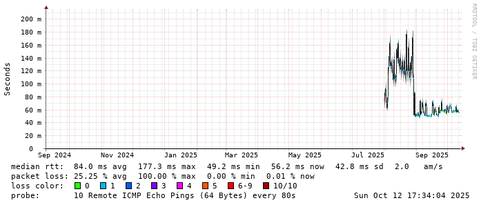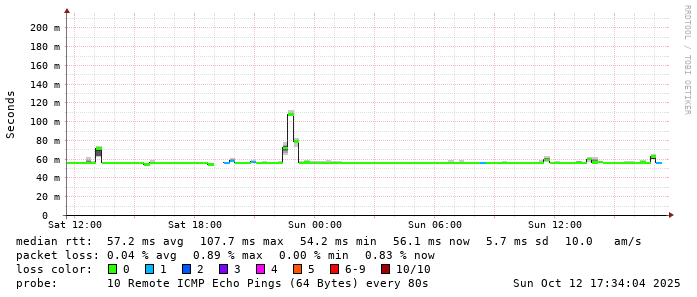 Start: 2025-10-12T04:46:54+0000HOST: ******** Loss% Snt Last Avg Best Wrst StDev 1. AS9678 103.98.75.193 0.0% 10 2.2 1.0 0.6 2.2 0.4 2. AS??? ??? 100.0 10 0.0 0.0 0.0 0.0 0.0 3. AS2914 ae-1.r25.taiptw01.tw.bb.gin.ntt.net 0.0% 10 1.2 0.7 0.5 1.2 0.2 4. AS2914 ae-10.r28.tkokhk01.hk.bb.gin.ntt.net 0.0% 10 20.7 20.6 20.4 20.9 0.2 5. AS2914 ae-24.a00.newthk04.hk.bb.gin.ntt.net 0.0% 10 28.0 28.2 27.9 28.8 0.3 6. AS2914 ae-0.lumen.newthk04.hk.bb.gin.ntt.net 0.0% 10 29.0 31.5 29.0 43.7 4.8 7. AS3356 ae1.3508.edge4.Tokyo4.level3.net 0.0% 10 63.5 60.9 56.0 78.7 7.2 8. AS3356 8.244.151.174 10.0% 10 57.4 57.7 57.4 58.5 0.4 9. AS2519 163.139.37.253 0.0% 10 56.7 57.7 56.4 63.6 2.4 10. AS2519 163.139.138.9 0.0% 10 57.7 58.6 57.6 65.0 2.3 11. AS2519 ns1.vectant.ne.jp 0.0% 10 56.2 56.1 56.1 56.2 0.0