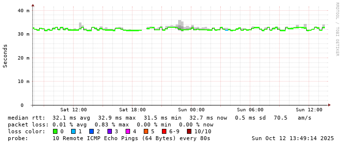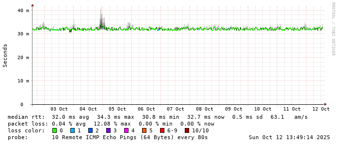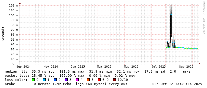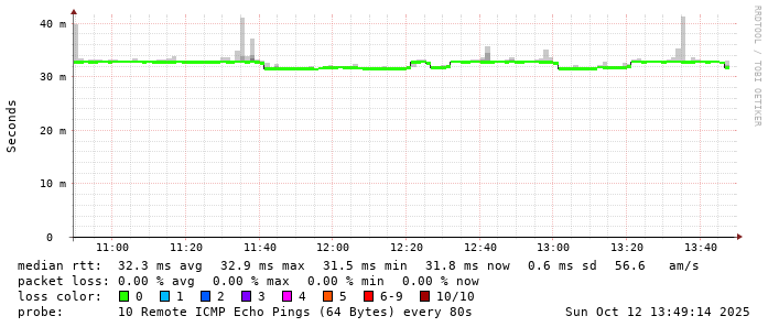 Start: 2025-10-12T04:47:12+0000HOST: ******** Loss% Snt Last Avg Best Wrst StDev 1. AS9678 103.98.75.193 0.0% 10 0.6 0.8 0.6 0.9 0.1 2. AS??? ??? 100.0 10 0.0 0.0 0.0 0.0 0.0 3. AS2914 ae-0.r24.taiptw01.tw.bb.gin.ntt.net 0.0% 10 0.6 0.9 0.5 1.6 0.4 4. AS2914 ae-15.r33.tokyjp05.jp.bb.gin.ntt.net 70.0% 10 33.0 35.8 33.0 40.8 4.3 5. AS2914 ae-1.a03.tokyjp05.jp.bb.gin.ntt.net 0.0% 10 31.4 31.9 31.3 35.5 1.3 6. AS2914 ae-1.asahi-net.tokyjp05.jp.bb.gin.ntt.net 0.0% 10 31.6 31.8 31.6 31.9 0.1 7. AS4685 cs1cr3-v1132.asahi-net.or.jp 0.0% 10 31.8 31.7 31.6 31.8 0.1 8. AS4685 falcon.asahi-net.or.jp 0.0% 10 32.8 32.9 32.7 32.9 0.1