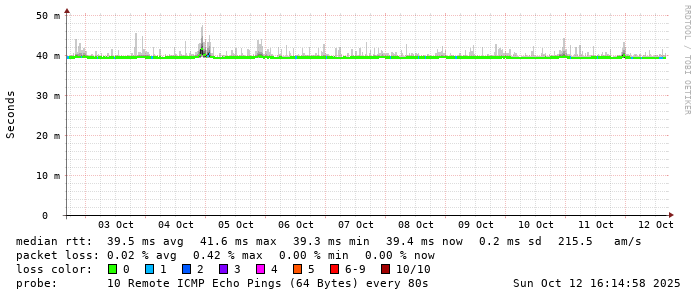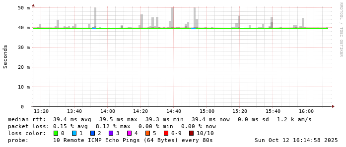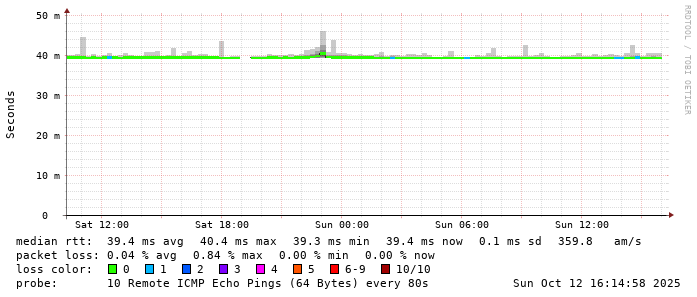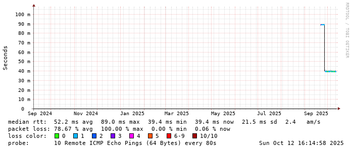 Start: 2025-10-12T04:47:48+0000HOST: ******** Loss% Snt Last Avg Best Wrst StDev 1. AS9678 103.98.75.193 0.0% 10 2.1 1.0 0.7 2.1 0.5 2. AS??? tw52.as9678.net 0.0% 10 1.1 1.1 0.9 1.3 0.1 3. AS??? ??? 100.0 10 0.0 0.0 0.0 0.0 0.0 4. AS3491 BE42.br04.tok02.as3491.net 20.0% 10 31.0 31.3 30.8 32.6 0.7 5. AS3491 63-216-242-110.static.as3491.net 0.0% 10 135.2 135.3 134.7 136.1 0.5 6. AS174 154.18.28.250 0.0% 10 30.8 30.9 30.8 30.9 0.1 7. AS2518 133.208.191.170 0.0% 10 32.0 32.1 32.0 32.2 0.0 8. AS2518 133.208.55.254 0.0% 10 39.2 39.6 39.1 43.1 1.2 9. AS??? ??? 100.0 10 0.0 0.0 0.0 0.0 0.0 10. AS9354 noname.aitai.ne.jp 0.0% 10 39.5 39.6 39.4 40.0 0.2 11. AS9354 gerbera.aitai.ne.jp 0.0% 10 39.5 39.5 39.5 39.6 0.0 12. AS9354 global217-001.aitai.ne.jp 0.0% 10 39.4 39.5 39.4 39.6 0.1