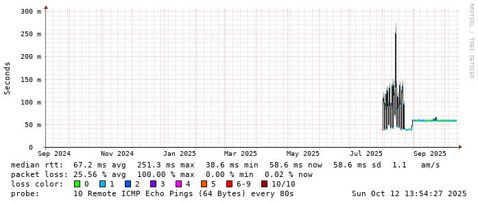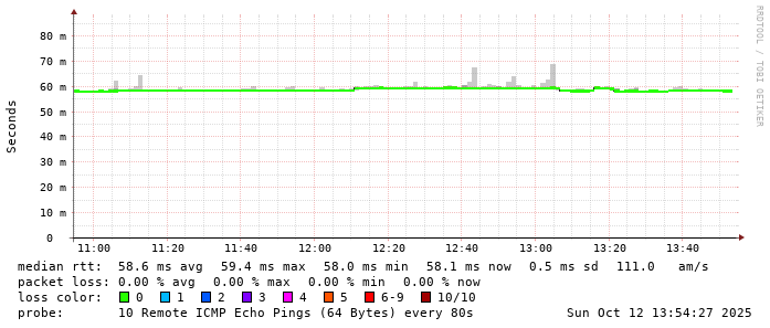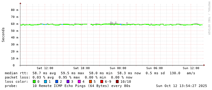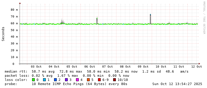 Start: 2025-10-12T04:48:43+0000HOST: ******** Loss% Snt Last Avg Best Wrst StDev 1. AS9678 103.98.75.193 0.0% 10 0.7 0.9 0.6 2.5 0.6 2. AS??? tw52.as9678.net 0.0% 10 1.0 1.3 1.0 3.4 0.7 3. AS??? ??? 100.0 10 0.0 0.0 0.0 0.0 0.0 4. AS3491 Bundle-Ether48.br02.hkg15.as3491.net 0.0% 10 28.3 28.2 28.2 28.4 0.1 5. AS3491 63-218-211-250.static.as3491.net 0.0% 10 28.5 28.3 28.2 28.5 0.1 6. AS2497 osk004bb00.IIJ.Net 0.0% 10 60.5 60.5 60.3 60.8 0.2 7. AS2497 osk005ip56.IIJ.Net 0.0% 10 54.7 54.9 54.7 56.1 0.4 8. AS2497 210.138.46.50 0.0% 10 57.7 57.8 57.5 58.6 0.3 9. AS17511 219.122.245.46 0.0% 10 59.5 59.5 59.4 59.6 0.1 10. AS17511 203.140.81.218 0.0% 10 58.6 58.6 58.5 59.3 0.3 11. AS17511 203.140.80.17 0.0% 10 59.4 59.6 59.3 61.1 0.5