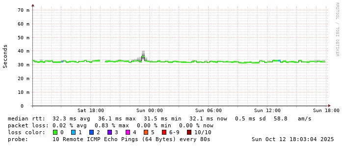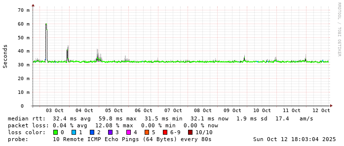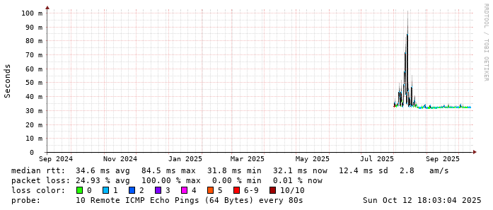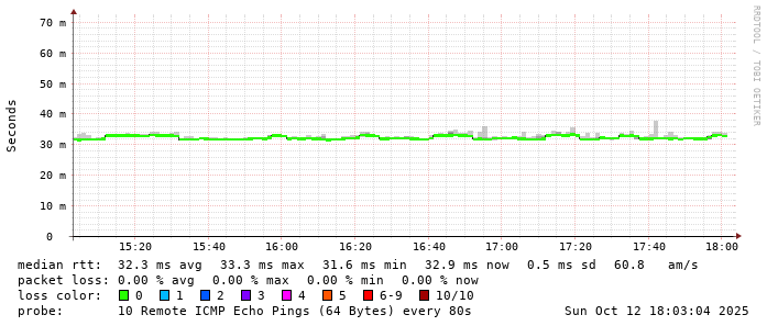 Start: 2025-10-12T04:50:19+0000HOST: ******** Loss% Snt Last Avg Best Wrst StDev 1. AS9678 103.98.75.193 0.0% 10 0.8 0.9 0.7 1.7 0.3 2. AS??? ??? 100.0 10 0.0 0.0 0.0 0.0 0.0 3. AS2914 ae-0.r24.taiptw01.tw.bb.gin.ntt.net 0.0% 10 0.6 0.7 0.5 1.1 0.2 4. AS2914 ae-15.r33.tokyjp05.jp.bb.gin.ntt.net 90.0% 10 32.8 32.8 32.8 32.8 0.0 5. AS2914 ae-1.a02.tokyjp08.jp.bb.gin.ntt.net 0.0% 10 35.5 33.1 31.8 37.9 2.1 6. AS2914 ae-12-2043.a02.tokyjp08.jp.ce.gin.ntt.net 0.0% 10 32.8 33.0 32.7 33.5 0.2 7. AS2514 0-0-1-2--2025.tky-t3-acr02.sphere.ad.jp 0.0% 10 33.8 33.6 33.3 33.9 0.2 8. AS2514 p202.tky-t3-ug101.sphere.ad.jp 0.0% 10 78.4 38.7 33.9 78.4 14.0 9. AS2514 202.229.146.54 0.0% 10 33.5 33.4 33.2 33.6 0.1 10. AS??? ??? 100.0 10 0.0 0.0 0.0 0.0 0.0 11. AS??? ??? 100.0 10 0.0 0.0 0.0 0.0 0.0 12. AS??? ??? 100.0 10 0.0 0.0 0.0 0.0 0.0 13. AS??? ??? 100.0 10 0.0 0.0 0.0 0.0 0.0 14. AS??? ??? 100.0 10 0.0 0.0 0.0 0.0 0.0 15. AS9605 ns1.spmode.ne.jp 0.0% 10 33.2 33.2 32.9 33.3 0.1