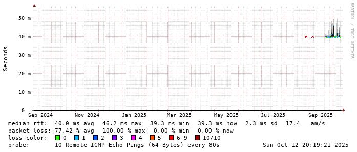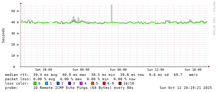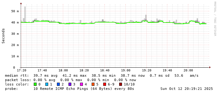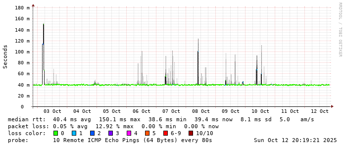 Start: 2025-10-12T04:51:15+0000HOST: ******** Loss% Snt Last Avg Best Wrst StDev 1. AS9678 103.98.75.193 0.0% 10 0.8 10.3 0.7 87.3 27.1 2. AS??? ??? 100.0 10 0.0 0.0 0.0 0.0 0.0 3. AS2914 ae-0.r24.taiptw01.tw.bb.gin.ntt.net 0.0% 10 0.5 1.5 0.4 7.8 2.2 4. AS??? ??? 100.0 10 0.0 0.0 0.0 0.0 0.0 5. AS2914 ae-3.r27.osakjp02.jp.bb.gin.ntt.net 70.0% 10 37.7 37.9 37.7 38.1 0.2 6. AS2914 ae-1.a03.osakjp02.jp.bb.gin.ntt.net 0.0% 10 37.3 37.6 37.3 38.8 0.4 7. AS2914 ae-1.ocn.osakjp02.jp.bb.gin.ntt.net 0.0% 10 37.5 38.8 37.5 42.3 1.7 8. AS4713 153.149.219.154 0.0% 10 38.2 49.7 37.8 148.3 34.6 9. AS4713 211.122.24.218 0.0% 10 38.2 45.1 38.2 106.5 21.6 10. AS9619 137.153.193.161 0.0% 10 38.3 39.2 38.3 41.5 1.2 11. AS9619 211.125.139.2 0.0% 10 38.8 46.8 38.7 111.9 22.9