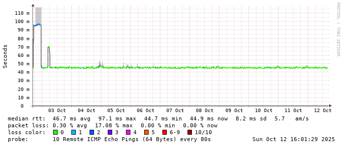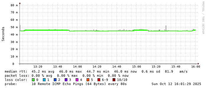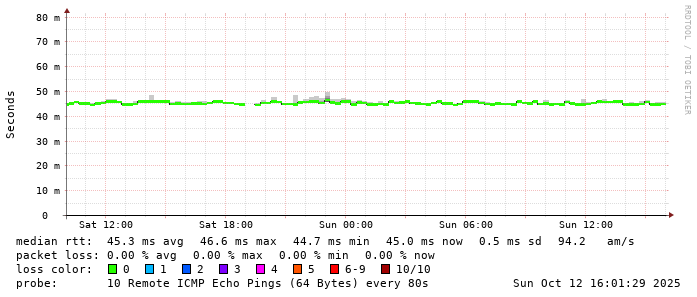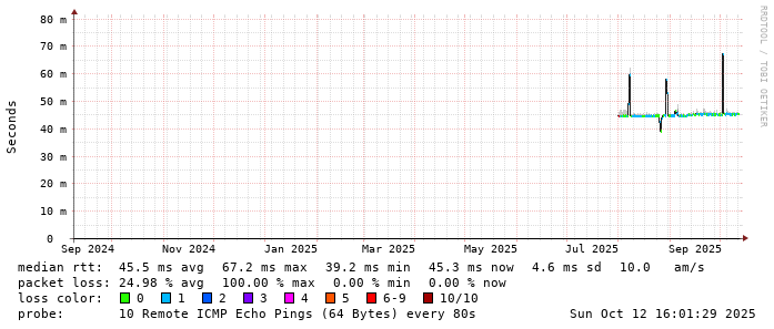 Start: 2025-10-12T04:51:33+0000HOST: ******** Loss% Snt Last Avg Best Wrst StDev 1. AS9678 103.98.75.193 0.0% 10 0.8 0.9 0.7 2.2 0.4 2. AS??? ??? 100.0 10 0.0 0.0 0.0 0.0 0.0 3. AS2914 ae-0.r24.taiptw01.tw.bb.gin.ntt.net 0.0% 10 0.6 0.6 0.5 0.8 0.1 4. AS2914 ae-15.r33.tokyjp05.jp.bb.gin.ntt.net 50.0% 10 32.7 36.9 32.7 47.1 5.9 5. AS2914 ae-1.a03.tokyjp08.jp.bb.gin.ntt.net 0.0% 10 31.7 32.5 31.6 38.1 2.0 6. AS2914 ae-1.yahoobb-tyo.tokyjp08.jp.bb.gin.ntt.net 0.0% 10 32.6 32.8 32.5 33.8 0.4 7. AS??? ??? 100.0 10 0.0 0.0 0.0 0.0 0.0 8. AS??? 101.203.70.254 0.0% 10 46.1 46.0 45.8 46.1 0.1 9. AS24255 core-sw2-e-49-1.ntwk.ttn.ne.jp 0.0% 10 45.9 46.7 45.8 53.9 2.5 10. AS24255 lah-sw-ge-1-2-0.ntwk.ttn.ne.jp 0.0% 10 52.2 60.8 49.3 150.5 31.5 11. AS24255 202.127.81.108 0.0% 10 45.1 45.2 45.0 45.8 0.2 12. AS24255 ns.ib-sol.co.jp 0.0% 10 46.0 46.0 45.9 46.1 0.1
