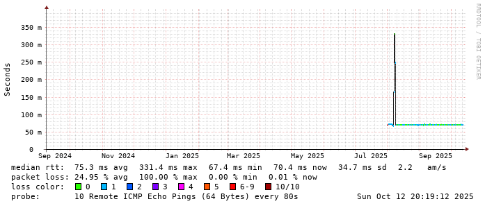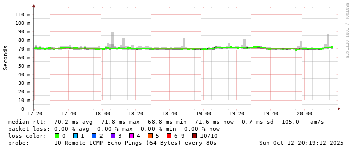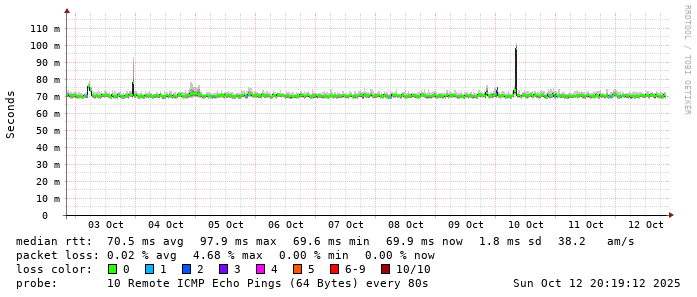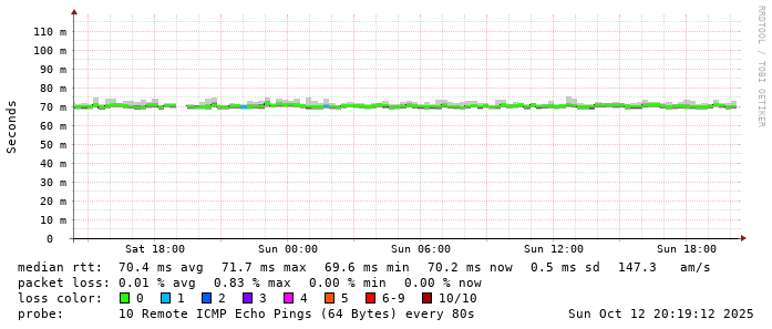 Start: 2025-10-12T04:53:43+0000HOST: ******** Loss% Snt Last Avg Best Wrst StDev 1. AS9678 103.98.75.193 0.0% 10 0.7 0.8 0.7 1.3 0.2 2. AS??? ??? 100.0 10 0.0 0.0 0.0 0.0 0.0 3. AS2914 ae-0.r24.taiptw01.tw.bb.gin.ntt.net 0.0% 10 0.8 0.8 0.5 1.0 0.2 4. AS2914 ae-15.r33.tokyjp05.jp.bb.gin.ntt.net 60.0% 10 36.3 33.8 32.8 36.3 1.7 5. AS2914 ae-1.a03.tokyjp08.jp.bb.gin.ntt.net 0.0% 10 31.6 31.7 31.5 32.2 0.2 6. AS2914 ae-0.lgu.tokyjp08.jp.bb.gin.ntt.net 0.0% 10 66.5 69.1 66.3 79.7 4.8 7. AS??? ??? 100.0 10 0.0 0.0 0.0 0.0 0.0 8. AS??? ??? 100.0 10 0.0 0.0 0.0 0.0 0.0 9. AS3786 1.208.113.134 0.0% 10 68.6 71.7 68.1 82.1 5.5 10. AS3786 1.208.113.178 0.0% 10 71.5 72.1 71.3 73.9 0.9 11. AS3786 1.213.40.126 0.0% 10 71.4 71.4 71.3 71.6 0.1 12. AS??? ??? 100.0 10 0.0 0.0 0.0 0.0 0.0 13. AS3786 106.240.90.1 0.0% 10 70.3 70.5 69.8 72.0 0.8