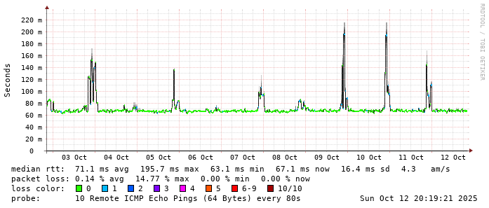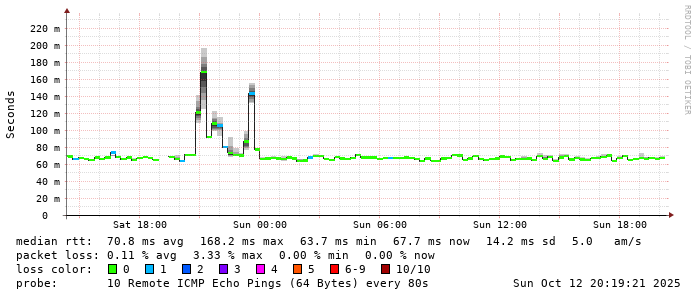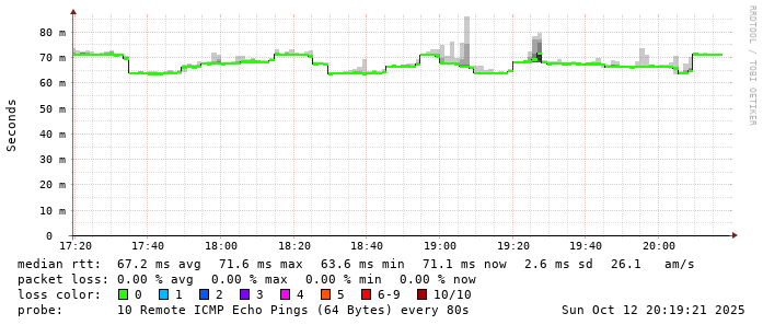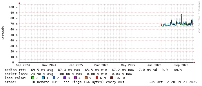 Start: 2025-10-12T04:56:42+0000HOST: ******** Loss% Snt Last Avg Best Wrst StDev 1. AS9678 103.98.75.193 0.0% 10 2.0 1.1 0.7 2.1 0.5 2. AS??? ??? 100.0 10 0.0 0.0 0.0 0.0 0.0 3. AS2914 ae-1.r25.taiptw01.tw.bb.gin.ntt.net 0.0% 10 0.7 0.8 0.5 1.1 0.2 4. AS2914 ae-10.r28.tkokhk01.hk.bb.gin.ntt.net 0.0% 10 20.6 20.9 20.5 21.4 0.3 5. AS2914 ae-3.r29.tkokhk01.hk.bb.gin.ntt.net 0.0% 10 20.7 20.9 20.5 22.9 0.7 6. AS2914 ae-6.r24.sngpsi07.sg.bb.gin.ntt.net 30.0% 10 59.9 60.0 59.8 60.4 0.2 7. AS2914 ae-15.a03.sngpsi07.sg.bb.gin.ntt.net 0.0% 10 66.7 66.8 66.7 66.9 0.1 8. AS2914 ce-4-1-3.a03.sngpsi07.sg.ce.gin.ntt.net 0.0% 10 79.7 82.4 79.7 105.9 8.3 9. AS4657 203.118.6.46 0.0% 10 79.8 79.9 79.7 80.4 0.2 10. AS4657 202.156.57-6.unknown.starhub.net.sg 0.0% 10 59.1 59.3 59.0 59.7 0.2 11. AS38466 123.136.99.190 0.0% 10 58.3 58.3 58.2 58.6 0.1 12. AS38466 123.136.99.186 0.0% 10 67.2 67.3 66.7 68.7 0.6 13. AS38466 123.136.99.85 90.0% 10 69.1 69.1 69.1 69.1 0.0 14. AS??? ??? 100.0 10 0.0 0.0 0.0 0.0 0.0 15. AS??? ??? 100.0 10 0.0 0.0 0.0 0.0 0.0 16. AS38466 123.136.104.44 0.0% 10 66.2 66.6 66.0 68.9 0.9