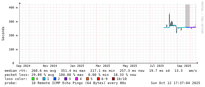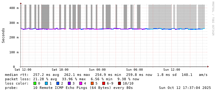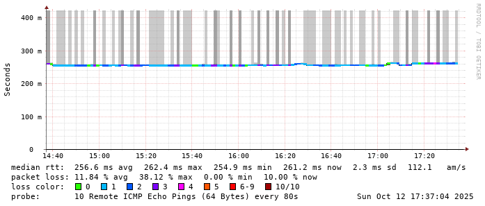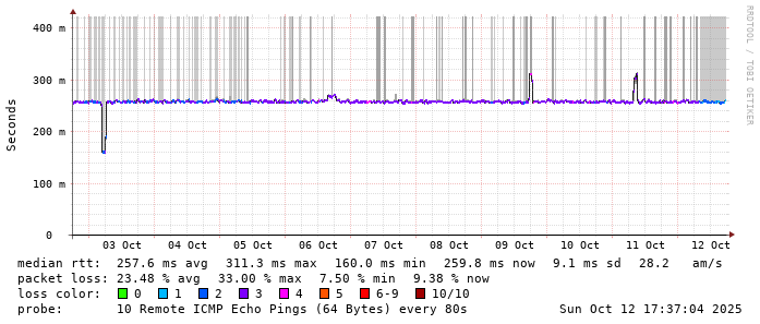 Start: 2025-10-12T04:58:01+0000HOST: ******** Loss% Snt Last Avg Best Wrst StDev 1. AS9678 103.98.75.193 0.0% 10 0.8 0.9 0.7 1.9 0.4 2. AS??? ??? 100.0 10 0.0 0.0 0.0 0.0 0.0 3. AS2914 ae-0.r24.taiptw01.tw.bb.gin.ntt.net 0.0% 10 1.0 0.6 0.4 1.0 0.2 4. AS2914 ae-15.r33.tokyjp05.jp.bb.gin.ntt.net 80.0% 10 31.6 34.6 31.6 37.7 4.3 5. AS2914 ae-4.r27.lsanca07.us.bb.gin.ntt.net 0.0% 10 134.0 134.0 133.9 134.2 0.1 6. AS2914 ae-3.a03.lsanca07.us.bb.gin.ntt.net 0.0% 10 132.6 132.7 132.5 133.9 0.4 7. AS??? ??? 100.0 10 0.0 0.0 0.0 0.0 0.0 8. AS174 be3360.ccr42.lax01.atlas.cogentco.com 0.0% 10 136.0 136.1 135.9 136.3 0.1 9. AS174 be5992.ccr82.sjc13.atlas.cogentco.com 0.0% 10 137.5 137.0 136.5 137.6 0.4 10. AS174 be5991.ccr22.sfo01.atlas.cogentco.com 0.0% 10 137.6 137.4 137.2 137.6 0.1 11. AS174 be5716.ccr21.pdx01.atlas.cogentco.com 0.0% 10 151.0 150.9 150.6 151.2 0.2 12. AS174 be2216.ccr51.pdx02.atlas.cogentco.com 0.0% 10 151.4 151.3 151.0 151.8 0.2 13. AS174 be3588.ccr71.syd01.atlas.cogentco.com 0.0% 10 283.8 283.9 283.8 284.0 0.1 14. AS174 154.18.96.111 0.0% 10 252.4 252.5 252.3 252.8 0.2 15. AS18200 202.87.128.66 0.0% 10 252.3 252.2 252.1 252.3 0.1 16. AS56055 202.22.224.42 0.0% 10 255.3 255.2 254.8 255.6 0.3 17. AS56055 fw.mls.nc 0.0% 10 254.9 255.3 254.9 256.5 0.5 18. AS56055 oueb.mls.nc 30.0% 10 255.5 255.2 255.0 255.5 0.2