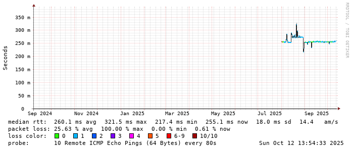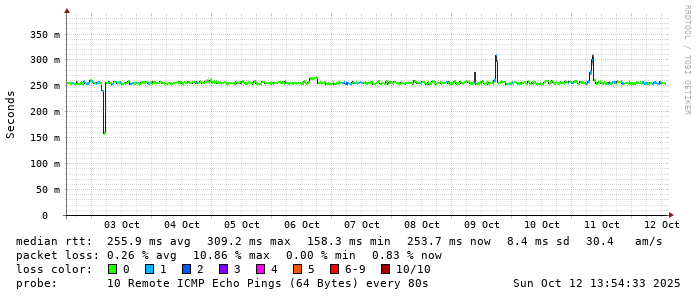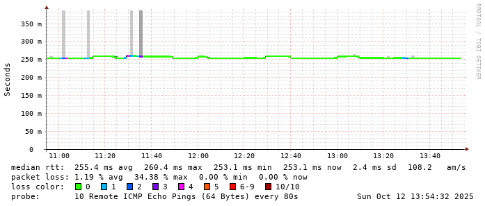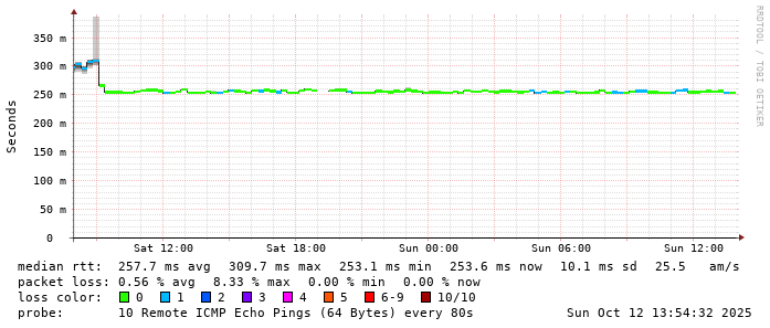 Start: 2025-10-12T04:58:38+0000HOST: ******** Loss% Snt Last Avg Best Wrst StDev 1. AS9678 103.98.75.193 0.0% 10 1.1 0.8 0.6 1.1 0.1 2. AS??? ??? 100.0 10 0.0 0.0 0.0 0.0 0.0 3. AS2914 ae-0.r24.taiptw01.tw.bb.gin.ntt.net 0.0% 10 0.5 0.6 0.5 1.1 0.2 4. AS2914 ae-15.r33.tokyjp05.jp.bb.gin.ntt.net 60.0% 10 32.2 34.2 32.0 39.8 3.8 5. AS2914 ae-4.r27.lsanca07.us.bb.gin.ntt.net 0.0% 10 134.1 134.2 134.1 134.4 0.1 6. AS2914 ae-3.a03.lsanca07.us.bb.gin.ntt.net 0.0% 10 132.9 132.9 132.8 133.0 0.1 7. AS??? ??? 100.0 10 0.0 0.0 0.0 0.0 0.0 8. AS174 be3271.ccr41.lax01.atlas.cogentco.com 0.0% 10 137.8 136.6 136.1 139.3 1.1 9. AS174 be3097.ccr81.sjc13.atlas.cogentco.com 50.0% 10 136.8 137.3 136.6 138.0 0.6 10. AS174 be3096.ccr21.sfo01.atlas.cogentco.com 0.0% 10 137.5 137.6 137.4 138.1 0.2 11. AS174 be5386.ccr21.pdx01.atlas.cogentco.com 0.0% 10 151.2 152.1 151.2 159.1 2.5 12. AS174 be2216.ccr51.pdx02.atlas.cogentco.com 0.0% 10 151.6 151.5 151.4 151.7 0.1 13. AS174 be3588.ccr71.syd01.atlas.cogentco.com 0.0% 10 284.3 284.3 284.0 284.7 0.2 14. AS174 154.18.96.111 0.0% 10 252.7 252.8 252.6 253.0 0.1 15. AS18200 61.5.212.1 0.0% 10 253.9 253.9 253.9 254.0 0.1